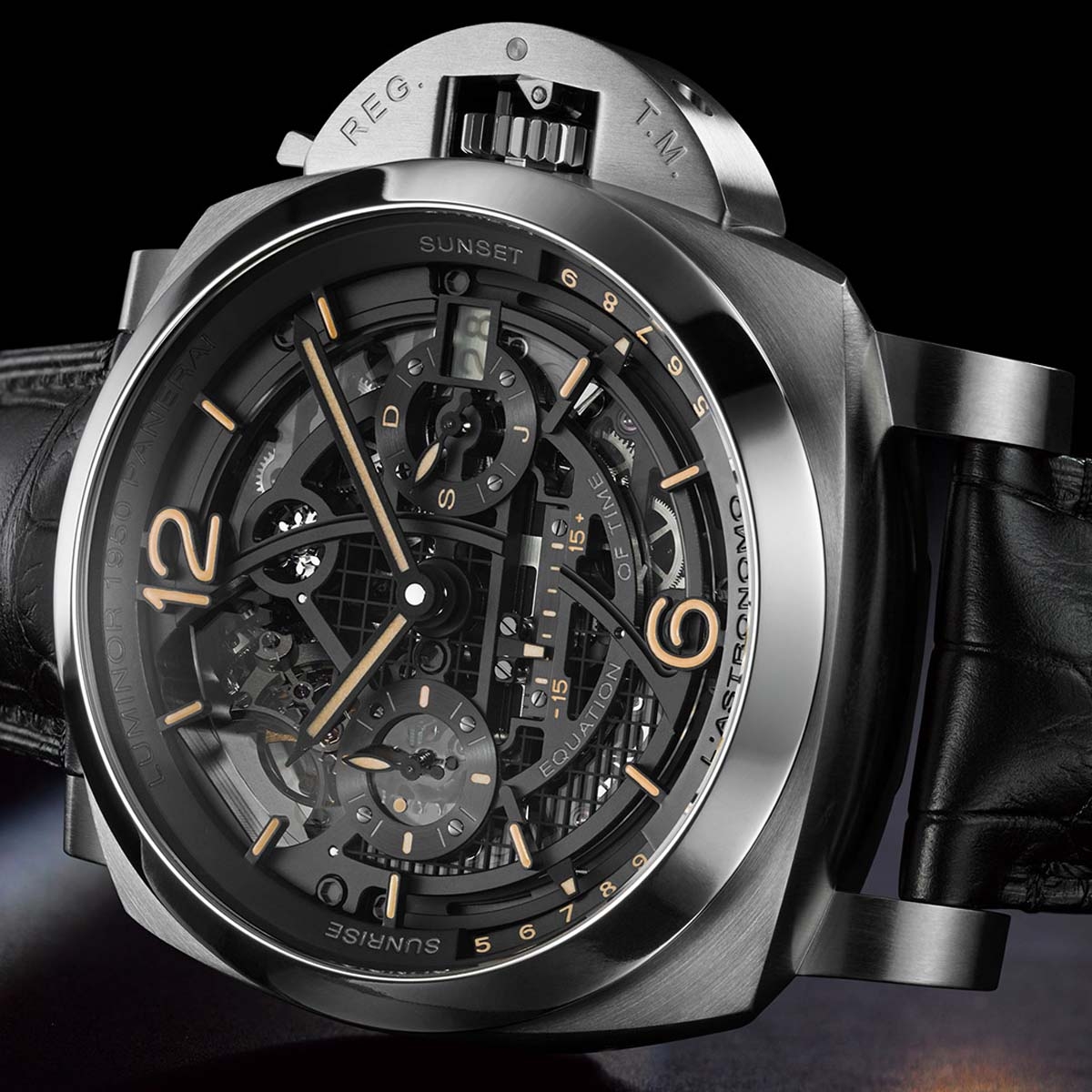 В рамках женевского часового салона SIHH 2018 компания Panerai представила довольно необычную, учитывая традиционно лаконичный функционал часов этого бренда, модель. Помимо целого букета усложнений (турбийон, время второго часового пояса, уравнение времени и др.), часы L'Аstronomo Luminor 1950 Tourbillon Moon Phases Equation Of Time GMT – 50 mm впервые в истории Panerai оснащены индикатором лунных фаз, в пару к которому здесь представлена оригинальная интерпретация указателя даты.