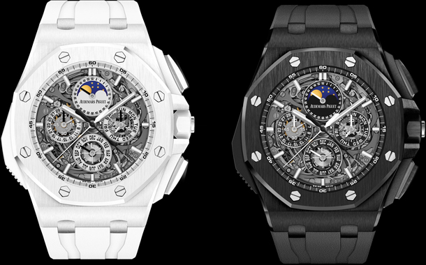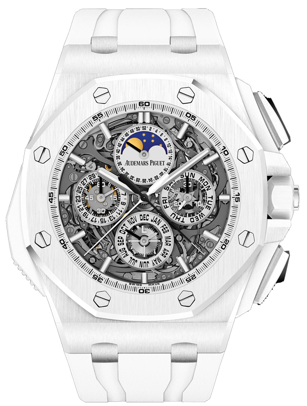 Швейцарская часовая мануфактура Audemars Piguet представила модель Royal Oak Offshore Grande Complication в двух версиях – из черной и белой керамики. Механизм, который используется в часах, включает в себя минутный репетир, вечный календарь и сплит-хронограф. Калибр 2885 используется в часах уже несколько лет.