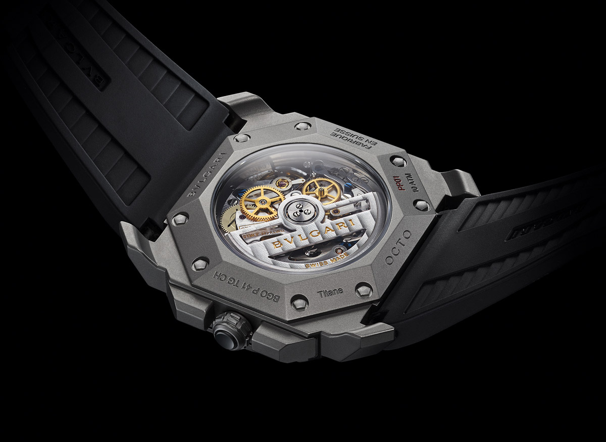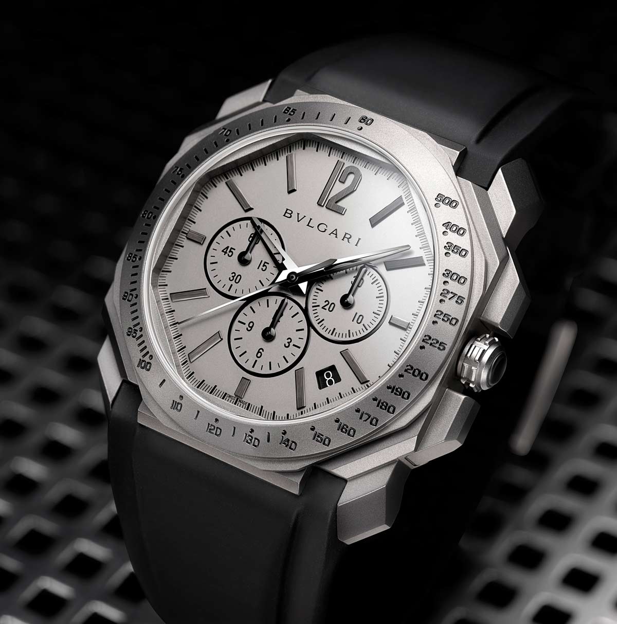 Новая модель Octo L’Originale Chronograph (Ref. 102859) от производителя швейцарских часов Bvlgari имеет корпус, выполненный в октогональной форме, изготовленный из титана, диаметром 41,0 мм, водонепроницаемый до 100 метров. На фиксированном круглом безеле выгравирована тахиметрическая шкала. Восьмигранная завинчивающаяся заводная головка, с черной керамической вставкой, расположена на 3 часах, а пушеры хронографа - на 2 и 4 часах. Сапфировое стекло установлено на передней стороне часового корпуса и на его завинчивающейся задней крышке. Циферблат серого цвета, с накладными стальными, с черным PVD-покрытием, арабскими цифрами, часовыми индексами и стрелками (в том числе часовая и минутная стрелки - скелетонизированные.