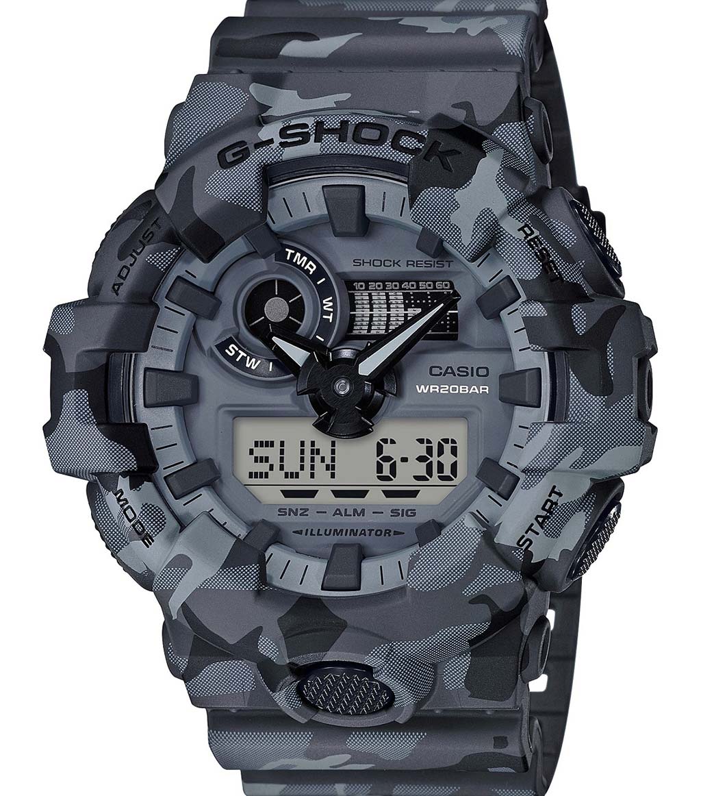 Компания Casio – безоговорочный чемпион в производстве часов для активного отдыха и любителей приключений. Сегодня японский часовой дом запустил под брендом G-Shock новую коллекцию GA700, состоящую из камуфляжных часов. Новинки выполнены в разном цвете и рисунке камуфляжа. Они отличаются типичным для своего класса дизайном и массивным корпусом.