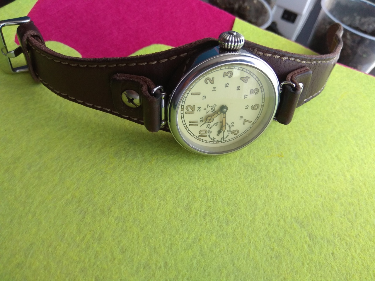 Сапожник взялся пошить ремни, шлевки, на которых будут крепиться часы к напульснику будут ставиться на заклёпки, по 2 на сторону. Кожа хромовая, тонкая черная, гладкая, без лака. Ремень двухслойный, толщиной около 2.5-3 мм. Цветовые вариации прострочки есть. С баклями могут быть проблемы, решаемые, для этого нужно время. Ценник сапожник объявит через пару дней. Есть основания полагать, что ценник не превысит психологическую отметку 1000 р. Только основания, уточнения через пару дней. На следующей неделе МБ представлю прототип.
