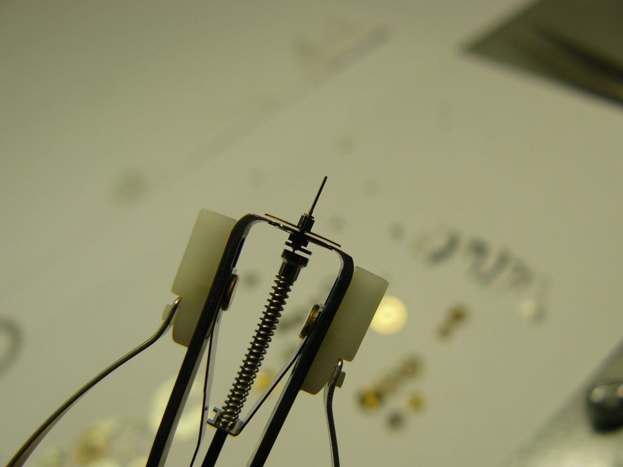 Вы видите, сверху на колесе сердечно сброса, ниже подпружинннная стальная тарелка сцепления и ещё ниже желтое колесо При выключенном хронографе тарелка приподнята двумя рычагами над жёлтым колесом, и это колесо должно свободно вращаться относительно неподвижной оси В вашем случае это не так, скорее всего виной тому загустевшее масло в отверстии триба жёлтого колеса Весь узел центрального колеса должен быть тщательно промыт в ультразвуке в специальном моющем растворе для механизмов Теоретически этого должно быть достаточно, но я дополнительно поступаю так: зажимаю тарелку сцепления стрелкосьемником Bergeon Presto, так чтобы центральный подпружинннный упор стрелкосьемника упирался в торец оси, тарелка приподнимается и колесо под ней может свободно вращаться В таком состоянии я погружаю узел в ультразвук на несколько десятков секунд После мойки так же ооотяниваю тарелку и проверяю легкость вращения колеса, дуя воздухом из груши В конце даю небольшое количество масла moebius 9010 в зазор между трибом и осью П.с. Проверьте ещё камень центрального секундного колеса в мосту, его посадку, не сдвинулся ли он вверх Это тоже может быть причиной, если ската при выключенном хронографе так и нет, но при нажатии на торец оси он появляется, значит дело в посадке камня |