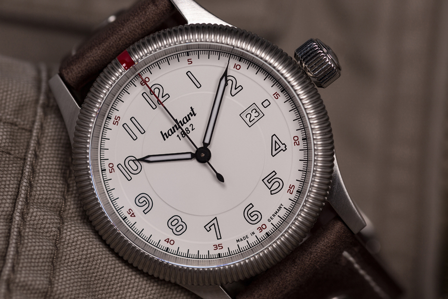 Круглый сатинированный корпус, изготовленный из нержавеющей стали, диаметром 42,0 мм, водонепроницаемый до 100 метров. Безель рифленый вращающийся, с красным маркером. Завинчивающаяся рифленая заводная головка с логотипом бренда Hanhart, выгравированном на ее торце, расположена на 3 часах. Сапфировое стекло с антибликовым покрытиеми защищает серебристый или черный циферблат с арабскими цифрами, часовой и минутной стрелками, покрытыми белым люминесцентным составом. Модель оснащена швейцарским автоматическим механизмом Sellita SW200, с балансовой частотой 28800 полуколебаний в час (4 гц), функциями индикации часов, минут секунд (посредством соответствующих центральных стрелок) и даты (посредством соответствующего цифрового указателя в прямоугольной апертуре, расположенной на 3 часах). Поставляется на коричневом ремешок из телячьей кожи с заклепками и застежкой из нержавеющей стали. Цена модели Hanhart Pioneer One составляет 890 евро. Вложение 2202387 Источник: https://www.watchtime.net/uhren/hanhart-pioneer-one/ |