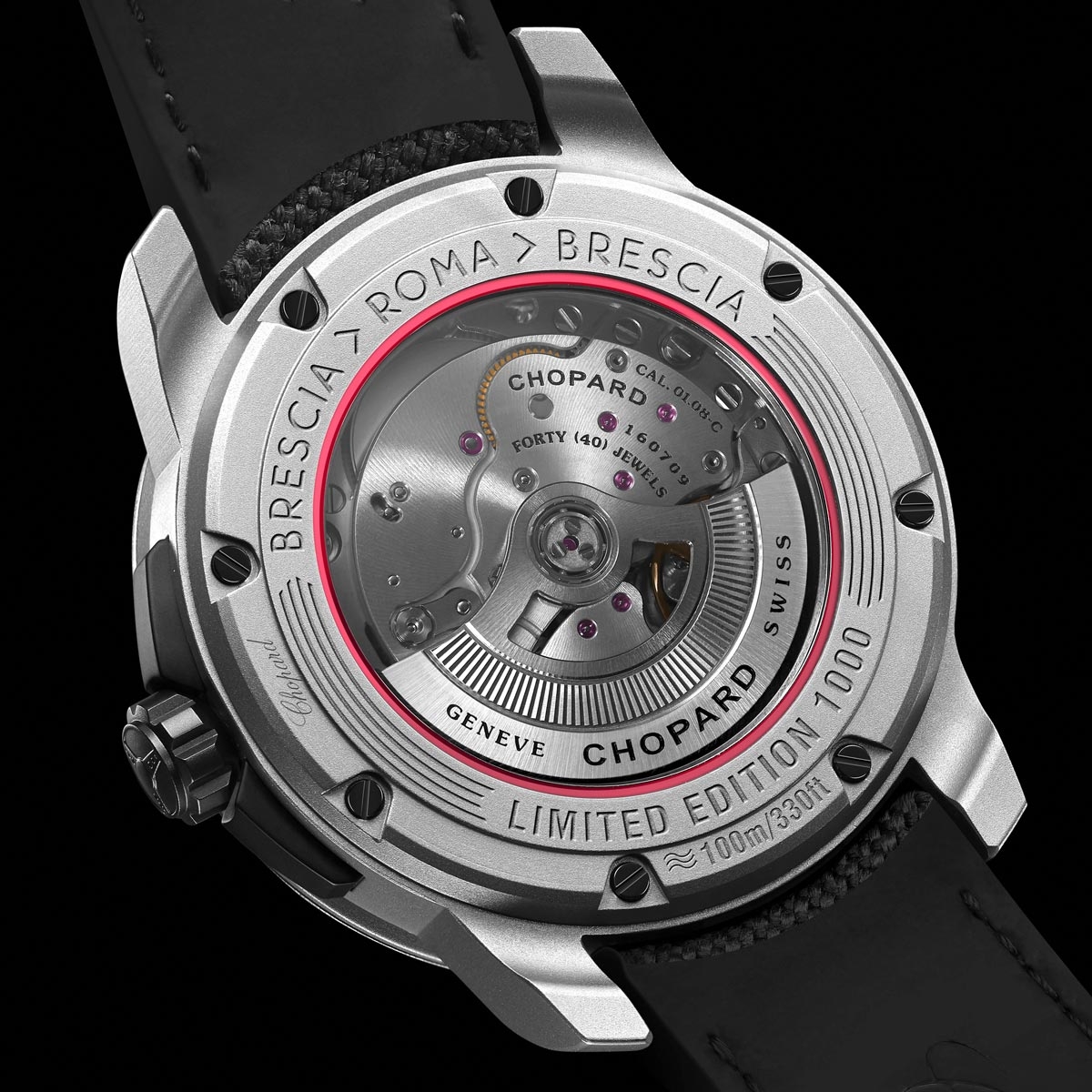 Часы получили титановый корпус диаметром 43 мм, прошедший пескоструйную обработку. Черный в цвет меткам и стрелкам, безель на часах изготовлен из алюминия. С тыльной стороны на корпус установлена завинчивающаяся крышка с прозрачной вставкой, которую на часах удерживают 8 винтов с PVD-покрытием. Глухая часть крышки украшена гравировкой Brescia > Roma > Brescia» (маршрут гонки).
