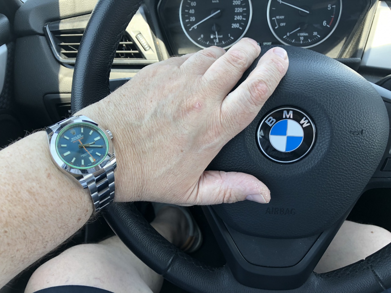 Вернулся в первый магазин и купил Милгаусс. При покупке мне поставили дополнительное звено, раздвинули складывающееся звено и сдвинули точку его крепление на максимальную позицию. При примерке было комфортно. Походил пару часов в Ролексе. Рука в теплом воздухе отекла и браслет стал тесным. Вернулся в магазин и попросил поставить дополнительное звено.