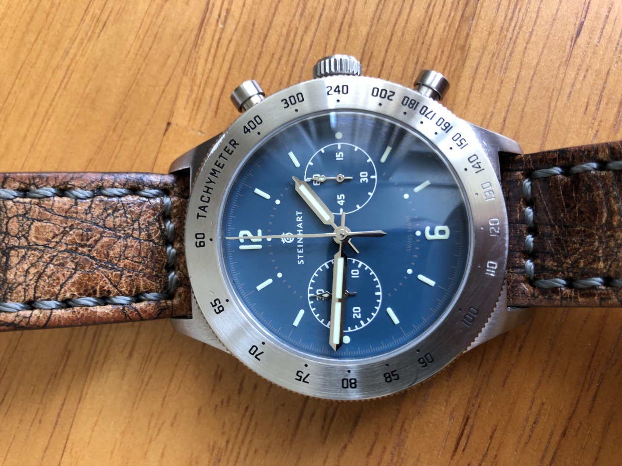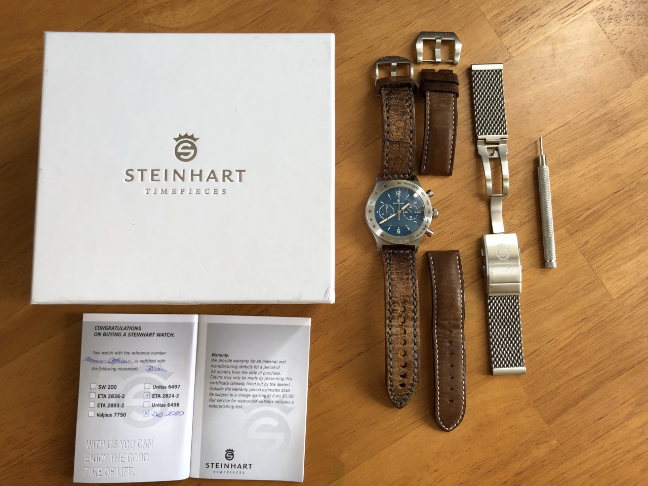 Пол: мужские Год покупки: 2017 БУ часы, состояние: AA (отличное) http://forum.watch.ru/images/market-question.png Полировка: нет Цена: 28 000 руб. (продажа) Коробка: есть Документы: есть Расстаюсь с красивым хронографом Marine-Officer от Steinhart. Территориально Москва. Основные ТТХ: Производство Швейцария, механические, 49 камней, механизм ETA 2824-2 с дополнительным модулем Dubois Dépraz DD 2030, корпус из нержавеющей стали 316 L, диаметр корпуса 44 мм, вес 128 гр, ремешок 22 мм, водонепроницаемость 5 АТМ (ограниченная, то есть нельзя плавать или принимать душ), задняя крышка панорамная. Состояние отличное, но имеются незначительные царапины на безеле, и немного стерта краска шкалы тахиметра в области отметок «110-130» поверх гравировки. Стоит отметить, что это только придает шарма часам, есть аналогичные модели от Steinhart с отсутствием вообще краски на шкале поверх гравировки. Часы отдаю в полном комплекте с коробкой, документами, инструментом для съема ремешка, в добавок с интересным винтажным ремешком, который, на мой взгляд, подходит даже лучше оригинального, и миланским браслетом из нержавеющей стали - все от Steinhart. Интересные факты о часах. Цвет циферблата очень красив, он не синий, а скорее оттенок бирюзового, в зависимости от освещения - переливающиеся оттенки морской волны. Такого красивого цифера не видел нигде. Он просто бомбический. Часы спроектированы по мотивам часов ВМС Италии периода конца второй мировой войны. Они будут радовать владельца! Вложение 2238574 Вложение 2238575 Вложение 2238576 Вложение 2238577 Вложение 2238578 Вложение 2238580 Полное описание от производителя: The Marine-Officer Blue is a modern interpretation of an observer chronograph that was developed towards the end of World War II for deck officers of the Italian Navy. The wide bezel of the finely brushed stainless steel case provides sufficient space for the engraved tachymeter scale, which can be used in conjunction with the chronograph to determine the speed of moving objects. The reduced dark blue dial ensures good readability, which is also given in darkness due to the indices and brushed silver hands being painted with C3 Superlumiova. Our Marine-Officer Blue is powered by a wonderfully decorated Swiss chronograph module caliber, the Dubois Dépraz DD 2030 which is automatically wound by our skeletonized gold rotor. This process can be observed through the stainless steel encased glass case back by gently shaking the watch. The Marine-Officer is a real eye catcher, and not only on the high seas, a MUST-HAVE for ever watch-enthusiast and -collector ! MOVEMENT ETA 2824-2 Elaboré * Swiss made * Automatic * 49 Jewels * Modul of Dubois Dépraz DD 2030 * Soigné-Finish * golden Rotor with Logo * Hour and minute hands silver with superluminova C3 * Second stop hand silver FUNCTIONS CASE * Stainless steel 316 L satined * Diameter 44 mm * Height 16 mm * Weight 128g * Lug width 22 mm screwed * Sapphire glass domed, with double anti-reflecting coatings on the interior side * Bezel Stainless Steel satin with Tachymeter-Skala * Back Stainless steel 316 L screwed with sapphire crystal * Waterproof to 5 ATM (limited water resistant, no swimming or shower) DIAL & HAND * Dial blue * Indexe Superlouminova C3 STRAP & BUCKLE * Strap Vintage leather brown 22mm * Buckle Stainless steel pin buckle PRE-V screwed-in 22mm with Logo ACCESSOIRES * Watchtool |