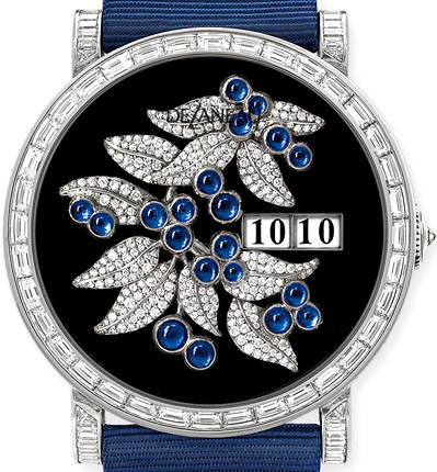 Дом Delaneau с понятной гордостью представил, единственные в своем роде, часы Amazone Blueberries 1608 Enamelled. Очень женственная, эта модель впечатляет высоким ювелирным искусством, изящно соединенным с ее механическим совершенством.