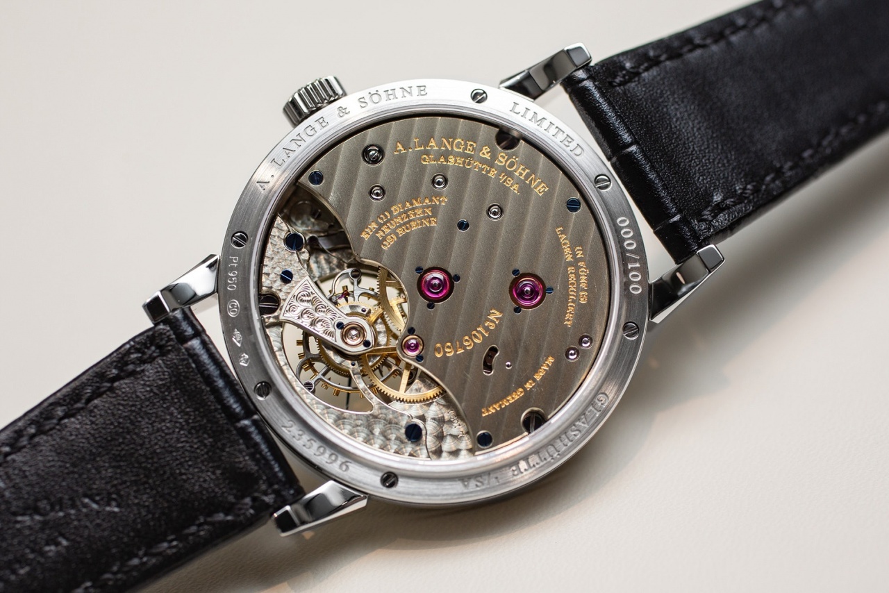 Основу циферблата составляет медная пластина, в то время как в классических часах A. Lange & Söhne используется золото. Небольшой нюанс, который усложнил работу мастерам-эмальерам – цифра «12» на циферблате обозначена красным цветом в память о карманных часах, которые когда-то выпускала компания A. Lange & Söhne. Наличие эмали прибавило корпусу толщины: при стандартном диаметре 39,5 мм изготовленный из платины 950-й пробы корпус имеет толщину 11,3 мм (в предыдущих версиях модели с турбийоном – 11,1 мм).