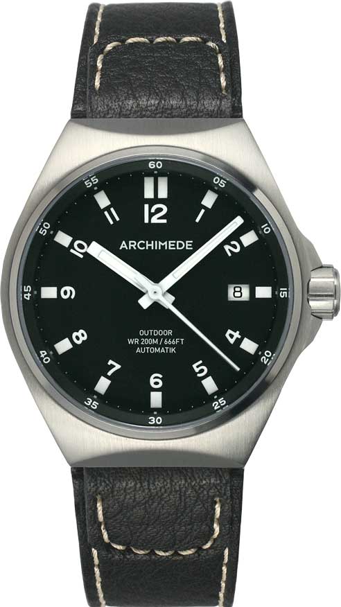 Корпус из нержавеющей стали, диаметром 42,2 мм, толщиной 10,6 мм, водонепроницаемый до 200 метров. Завинчивающаяся защищенная заводная головка. Сапфировое стекло на лицевой стороне корпуса. Задняя крышка завинчивающаяся. Циферблат черный. Белые арабские цифры и часовые индексы, а также - часовая и минутная стрелки, с люминесцентным покрытием. Модель оснащена швейцарским автоматическим механизмом Sellita SW200, на 26 камнях, с балансовой частотой 28800 полуколебаний в час, запасом хода 38 часов, функциями индикации часов, минут, секунд (центральные стрелки) и даты (в апертуре на 3 часах). Поставляется с кожаным ремешком или на браслете из нержавеющей стали. MSRP модели на ремешке составляет 445 евро, на браслете - 495 евро. Вложение 118631Вложение 118632Вложение 118633Вложение 118634 Источник: http://www.archimede-uhren.de/EN/Outdoor.htm |