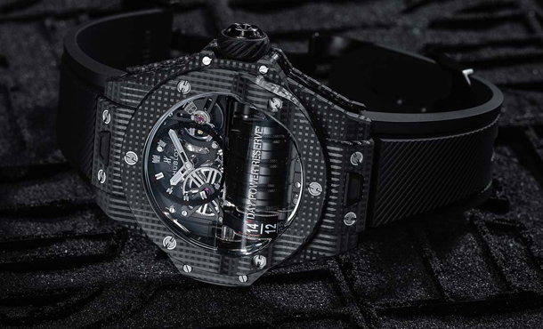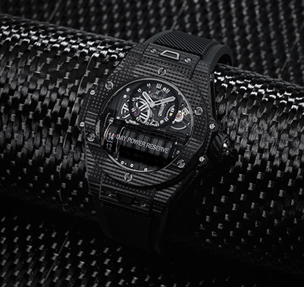 Будучи лидером в области использования инновационных материалов, Hublot представляет свои новые «All Black» Big Bang MP-11 с 3D-карбоновым корпусом. Состоящий из полимерной матрицы с трехмерными волокнами, ранее не использовавшейся в часовом производстве, этот сверхлегкий материал был усилен трехмерной волокнистой плёнкой, сформированной в корпусе, вдохновленный двигателем скоростного болида. В этой механической архитектуре открывается вид на 7 цилиндровых барабанов и линейный индикатор запаса хода.