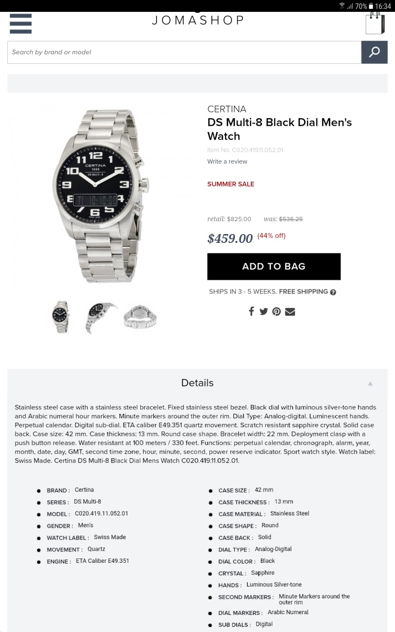 Необходима ваша помощь в подборе аналогово-цифровых часов, у которых есть обычные стрелки и цифровой дисплей. Часы нужны повседневные, универсальные и удобные, т.е. исключается всякая экзотика в виде "дизайнерских" часов, а также с обилием позолоты и загроможденным циферблатом, т.е. внешность хотелось бы как можно более лаконичную. Материал корпуса и браслета предпочтительно сталь, хотя возможен и титан. По функционалу хотелось бы присутствие второго часового пояса, секундомер, таймер. По размеру корпуса нормально сидят 41-43 мм. Бюджет определил 500-900$. Швейцарские или японские - не принципиально. Оптимальным для себя вариантом вижу Certina DS Multi-8, но эту модель давно не выпускают, а обновления линейки почему-то нет. Просьба помочь в подборе часов с указанными условиями, а то при самостоятельном поиске подобрать не удалось, впечатление, что данный формат часов почему-то обойден вниманием производителей. |