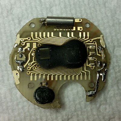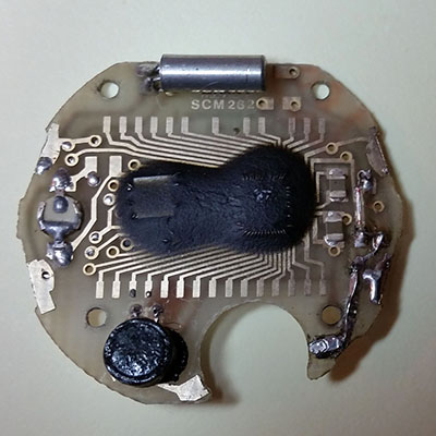 Лишний припой с платы убрал сколько мог. Пьезоэлемент прочистил. Все контакты на плате, резинках и дисплее аккуратно прочистил. Резинки при сборке поменял местами с целью диагностики. Всё собрал. Батарейку заменил на новую, теперь 1.6V. Не помогло. Сегменты не восстановились, а пьезоэлемент при тестировании, как и раньше, выдает азбуку Морзе (две точки - пауза), громкость нормальная. Похоже, что просто первая мелодия в ряду - это и есть простое пикание, а дальнейшие мелодии просто не устанавливаются. Интересно, что нажатие сразу трёх кнопок на этой плате не производит общий сброс, а включает все возможные сегменты, а также текущий звук. Очень удобно для диагностики. При более внимательном рассмотрении платы заметил, что эпоксидка не закрывает все провода от микросхем, они входят и выходят из-под смолы дугой, и как минимум один металлический проводок от микросхемы в правом нижнем углу оборван, но, похоже, не у самого основания, думаю, соединить можно. Наверное, этим обьясняется отсутствие двух горизонтальных сегментов в последней цифре секунд (в этот момент там должна была отображаться восьмерка). Похоже, также где-то повреждён еще один из тоненьких проводков, отвечающий за выбор следующей мелодии, поэтому часы "застряли" на первой мелодии. Думаю, что эти два тоненьких проводка были повреждены в результате коррозии, потому что часы Montana "знамениты" полным отсутствием защиты от влаги. Хотелось бы попробовать восстановить проводки микросхем, но не знаю, что за металл, можно ли его паять, или просто попытаться воспользоваться токопроводящим клеем, работая под хорошим увеличением. Есть ли у кого-нибудь подобный опыт? Буду благодарен за совет. Вложение 2354610 Вложение 2354611 Вложение 2354726 |