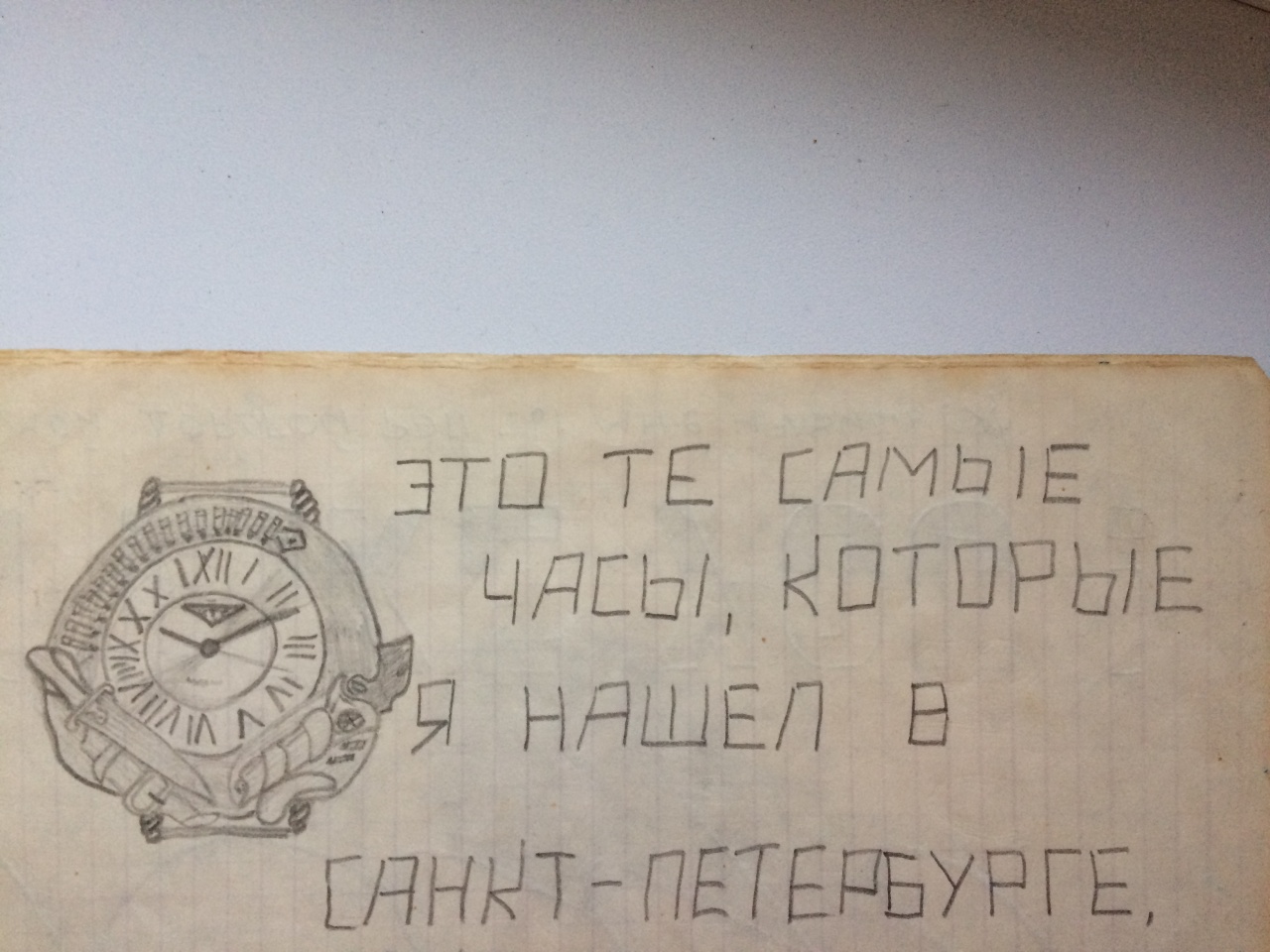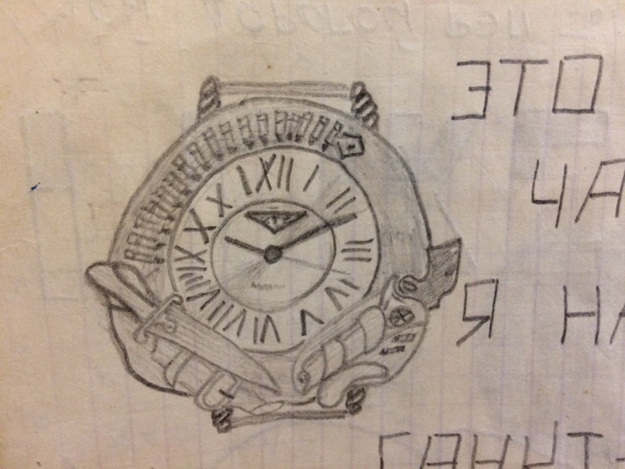 В 1998 году ездил в Питер с отцом, когда гуляли по городу, я нашёл на земле часы с необычным оформлением, подобрал. Когда вернулись домой, поставил батарейку, они пошли. Носил их пару лет, но потом потерял так же как и нашёл. Часы мне очень нравились, наверное поэтому решил их нарисовать в то время, получилось очень похоже. Пистолет, кинжал и патронташ объёмные, примерная форма логотипа тоже нарисована. Помогите пожалуйста узнать, что это за часы, ностальгия. Вложение 2393150 |