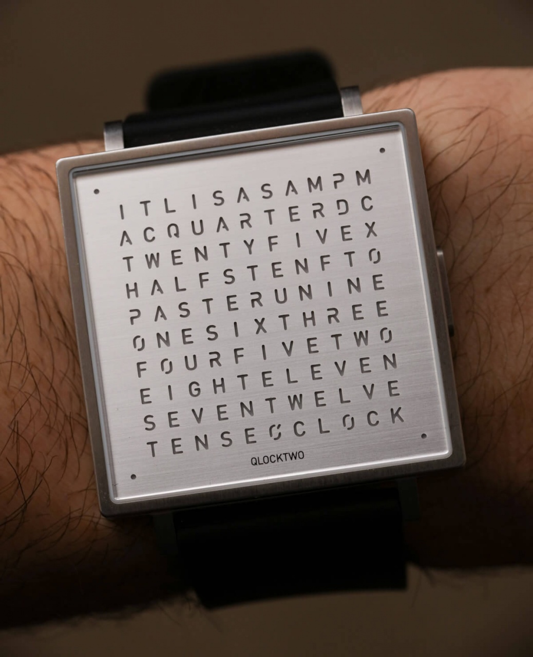 Жидкокристаллический экран заполнен буквами в хаотическом, казалось бы, порядке. Но при нажатии на кнопку, расположенную на правой стороне квадратного корпуса, некоторые из этих букв подсвечиваются, образуя фразу — например, “It is twenty to five”, что означает “сейчас без двадцати пять”. Двукратное нажатие позволяет аналогичным образом узнать текущую дату, троекратное индицирует секунды, а нажатие типа “точка-тире” сообщает об остатке заряда батареи (естественно, внутри не механика, а электроника). Гаджет можно настроить на один из 20 языков. К сожалению, среди них, кажется, нет русского. Часы предлагаются во множестве цветовых решений и с самыми различными ремешками и браслетами: кожа, замша, каучук, миланское плетение. Водонепроницаемость стального корпуса вполне взрослая — 50 метров. Впрочем, QlockTwo часто используют не как наручные часы, а как настольные или настенные, для украшения интерьера, причем некоторые энтузиасты обвешивают ими все помещения своего жилища: в гостиной белые, в спальне кремовые, в столовой черные и так далее. Первоначальная модель QlockTwo невелика по размеру — 35 на 35 миллиметров. Совсем недавно компания объявила о выпуске 39-миллиметровой версии. Ее цена — 1240 долларов. Вложение 2409340Вложение 2409341 Вложение 2409342Вложение 2409343 Вложение 2409344 Источник: https://watchalfavit.ru/news/chasy-q...remya-slovami/ |