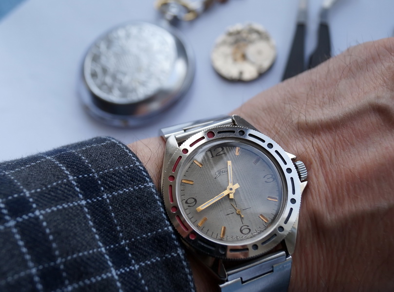И я давеча решил, что добру пропадать? Корпус без дела лежал, ждал, ко в нем поселится. Механизм попался хороший, поднял его, отрегулировал. Циферблат шикарный, как с витрины. Только никак не могу добиться верной передачи на фото этого гильоширования. Но ничего. Вот такое собралось.