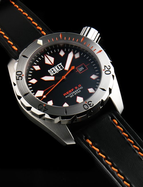 Serket Telson Limited Edition Круглый корпус из матовой и полированной нержавеющей стали 316L, диаметром 48 мм и толщиной 16 мм, водонепроницаемый до 100 метров. Заводная головка на 3 часах, диаметром 8 мм и высотой 6 мм. Выпуклое сапфировое стекло с лицевой стороны корпуса, на задней крышке - также сапфир. Вес часов 141 грамм. Циферблат черный с люминесцентным покрытием индексов и стрелок. Модель оснащена механизмом ETA 6497 с ручным заводом, отделанный Cotes D’ Genève. Ремешок из черной кожи с пряжкой из полированной нержавеющей стали или браслет из полированной (матовой) нержавеющей стали. Лимитированный выпуск 200 экземпляров. Доступны в белом, синем и желтом цвете. Цена модели составляет $ 1,250. Serket Риф Diver 2,0 Limited Edition Круглый корпус из матовой и полированной нержавеющей стали 316L, диаметром 48 мм и толщиной 16,5 мм, водонепроницаемый до 300 метров. Заводная головка на 2 часах, диаметром 10 мм и высотой 8 мм. Дайверский однонаправленный безель (на 120 щелчков). Сапфировое стекло с лицевой стороны корпуса толщиной 4 мм, на задней крышке - минеральное стекло толщиной 2 мм. Вес часов 168 грамм. Циферблат черный с люминесцентным покрытием индексов и стрелок. Модель оснащена автоматическим механизмом Sellita SW200 на 26 камнях. Ремешок из черной кожи с оранжевой прошивкой или черный резиновый дайверский ремешок с пряжкой из нержавеющей стали. Лимитированный выпуск 200 экземпляров. Цена модели составляет $ 999. Источник: http://www.horozima.com/2010/10/serk...n-limited.html |