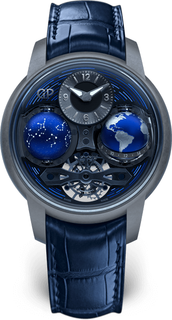 48-миллиметровый корпус часов Cosmos представляет собой модель мира. Выполненный из титана с микрозернением, он устанавливает границы своей собственной вселенной. Выпуклое сапфировое стекло циферблата выглядит словно объектив телескопа. Под ним «бьется» совершенно новый механизм калибра GP09320 с ручным заводом, материализовавшийся из космической черной дыры, чтобы запустить на орбиту модель Cosmos.