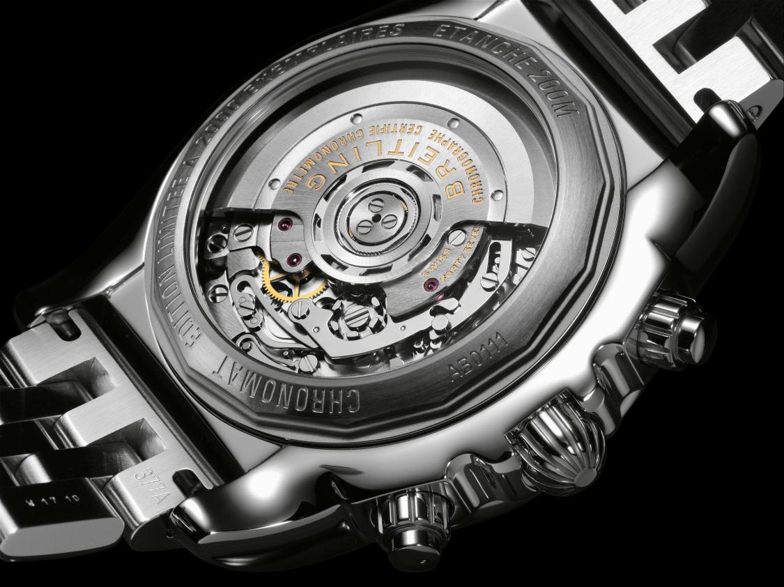 Новая лимитированная версия модели Chronomat 01, выпущенная часовой компанией Breitling, имеет эксклюзивную отделку и окно на задней крышке корпуса, защищенное сапфировым стеклом, благодаря чему прекрасно просматривается мануфактурный калибр.