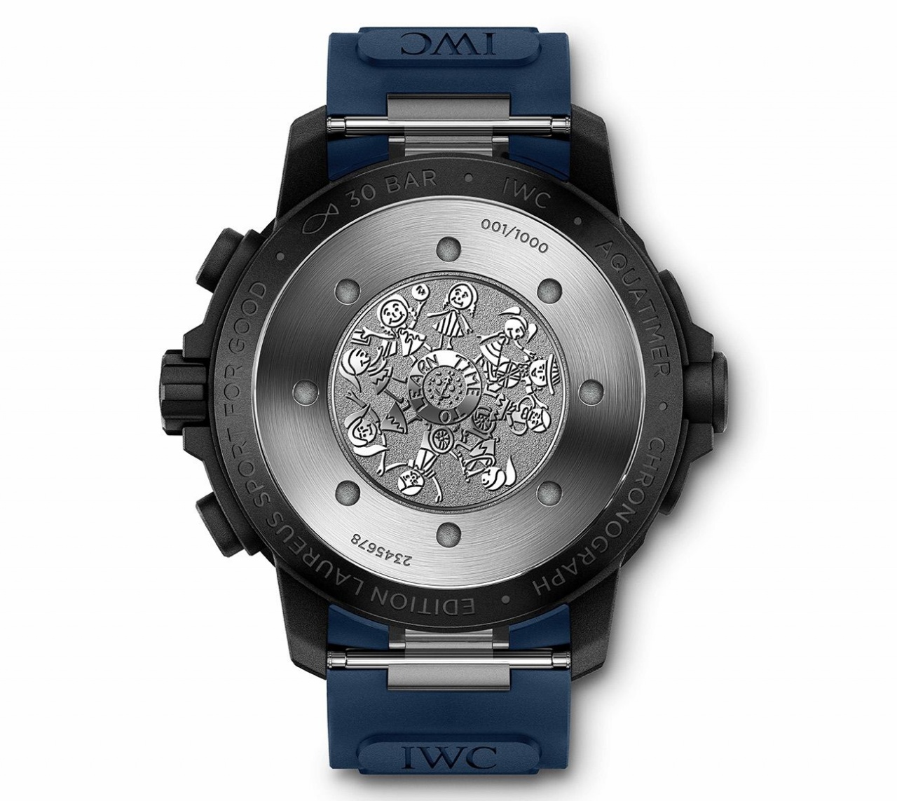 Глухая задняя крышка часов украшена гравировкой, за основу которой взята работа-победитель ежегодного конкурса детских рисунков. В 2019 году темой конкурса, организованного маркой IWC совместно с фондом Laureus стал слоган «Время учиться».