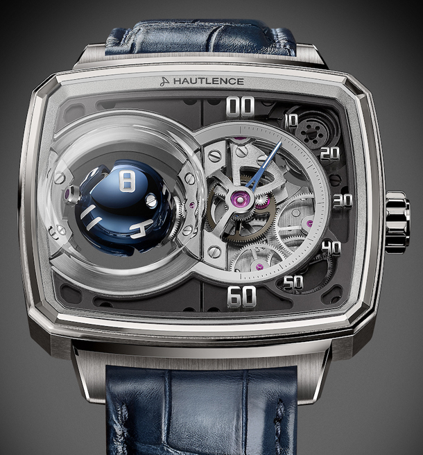 Компания Hautlence представила новую модель HL Sphere с кобальтово-синей сферой на циферблате. Вращающийся шар расположен в левой части циферблата и служит для отображения текущего часа. Справа от сферы находится циферблат с ретроградной шкалой, показывающий минуты. Минутная дорожка и цифры прикреплены к сапфировому стеклу.