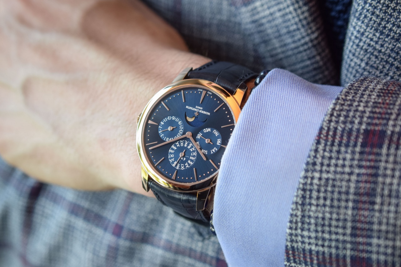 Швейцарская часовая компания Vacheron Constantin представила новую модель Patrimony Perpetual Calendar Ultra-Thin Rose Gold and Blue Dial, отмеченную "женевским клеймом".