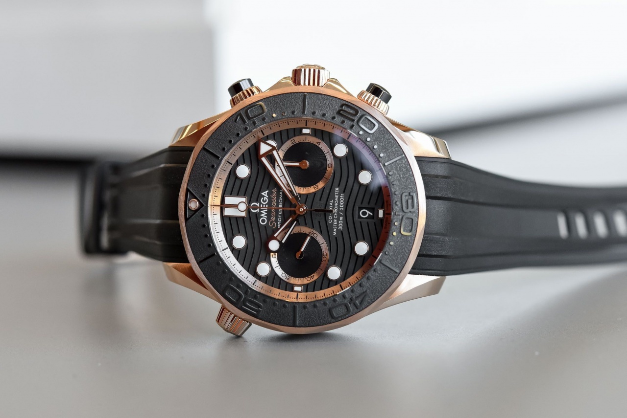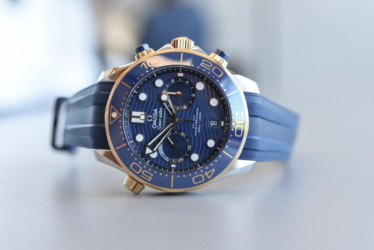 В прошлом году в рамках салона Baselworld 2018 компания Omega представила серию обновленных моделей Seamaster Diver 300M, известных в народе как «часы Джеймса Бонда». Модель получила обновленный корпус, керамический циферблат с лазерной гравировкой, керамический безель со шкалой, нанесенной эмалью, и, главное, мануфактурный механизм категории Master Chronometer. Первый абгрейд уже новой линейки коснулся функционала. В 2019 году модель Seamaster Diver 300M обзавелась хронографом и получила 3 варианта исполнения: сталь, биколор и золото Sedna. Цвет циферблата – черный, синий, серый с синим. Носить часы предлагается на каучуковом ремешке или стальном/биколорном браслете.
