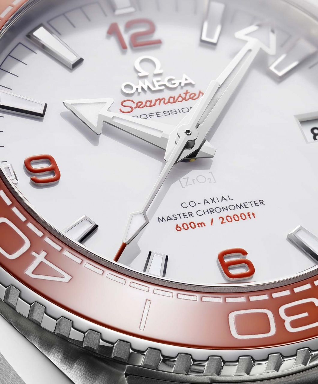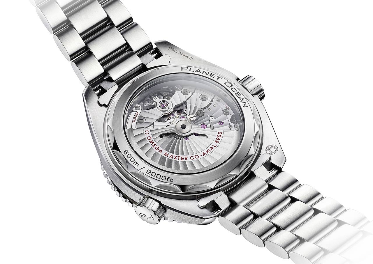 Новая версия модели Seamaster Planet Ocean 600M Orange (Ref. 215.30.44.21.04.001 - на браслете из нержавеющей стали и Ref. 215.32.44.21.04.001 - на ремешке НАТО) от швейцарской часовой компании Omega имеет круглый корпус, изготовленный из нержавеющей стали, с матовыми и полированными поверхностями, диаметром 43,5 мм, водонепроницаемый до 600 метров. На торце "притопленной" завинчивающейся рифленой заводной головки, расположенной на 3 часах, выгравирован логотип бренда Omega. Вращающийся однонаправленный безель с оранжевым керамическим кольцом с разметкой, заполненной жидкой керамикой и SuperLumiNova. На 10 часах размещен гелиевый клапан. Сапфировое стекло установлено на передней стороне корпуса (выпуклое, с антибликовым покрытием) и на его завинчивающейся задней крышке. Циферблат белого цвета, с накладными родированными часовыми индексами, покрытыми, как и стрелки, люминесцентным составом SuperLumiNova. Арабские цифры на циферблате покрыты лаком оранжевого цвета.