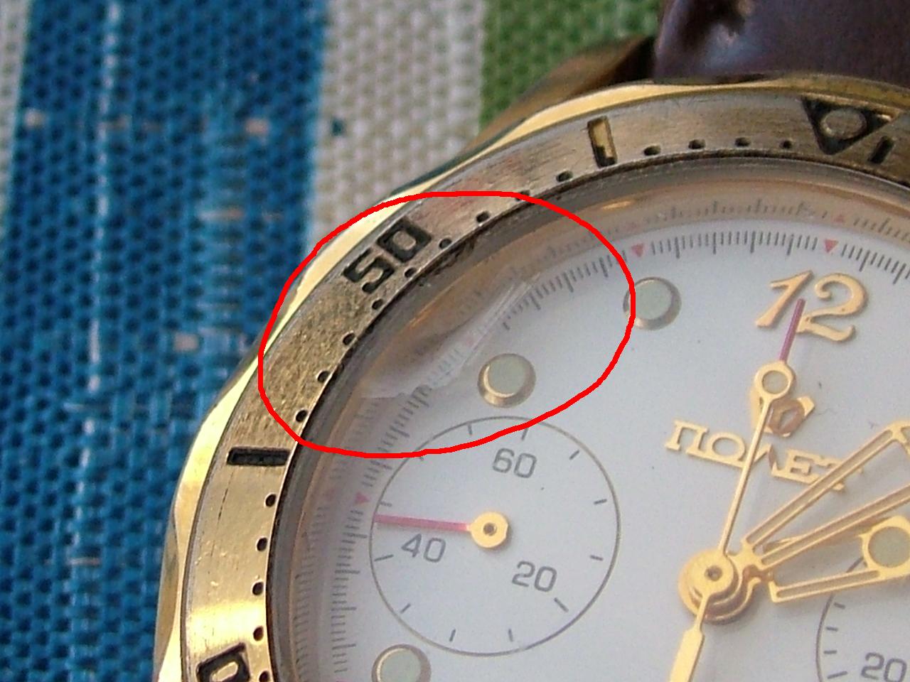 Уважаемые форумчане, имею вот такой ПОЛЕТ, приобретался лично в 90-х (точно вряд ли вспомню, только если найду коробочку с паспортом). За время эксплуатации никаких нареканий в сторону ПОЛЕТА высказать не могу, одни положительные эмоции. Однако повседневное ношение привело к таким плачевным последствиям - перестал вращаться безель, треснуло стекло и главное разьело металл на корпусе (обвел красным).Собственно вопросы такие