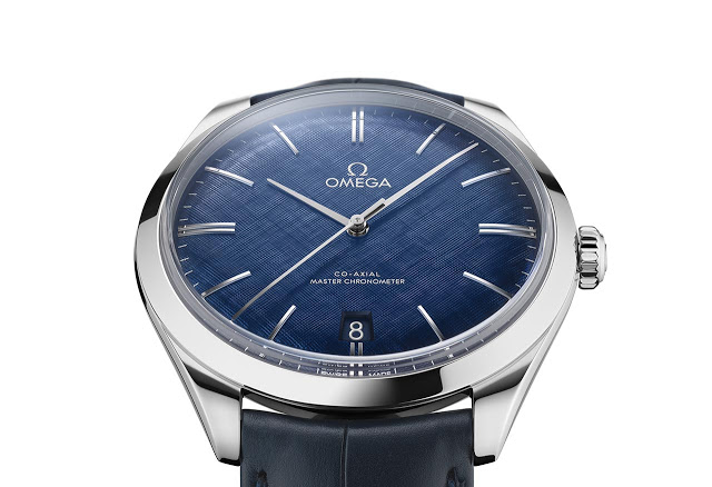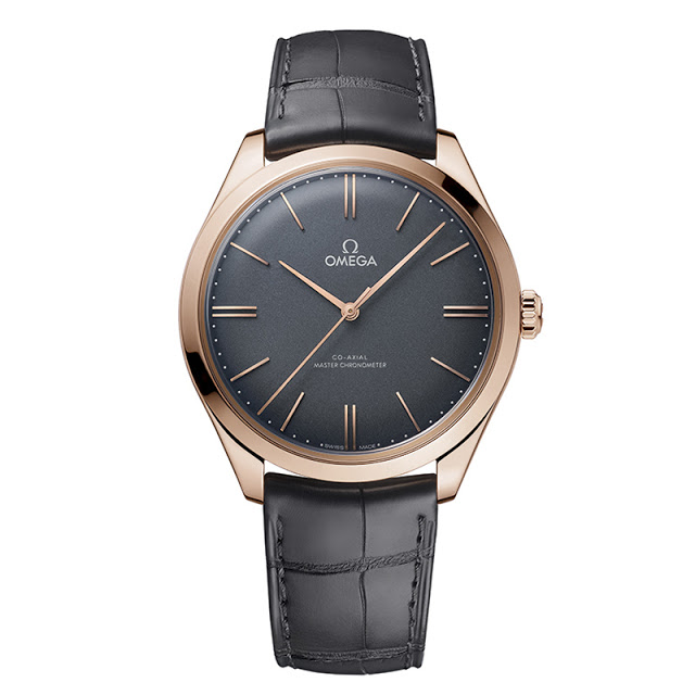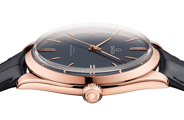 Омега представила новые модели в линейке De Ville. Первая — в размере 40 мм, с корпусе с зеркальной полировкой. Сапфировое стекло прикрывает циферблат, которые сделан выпуклым. Метки и стрелки выполнены из белого золота.