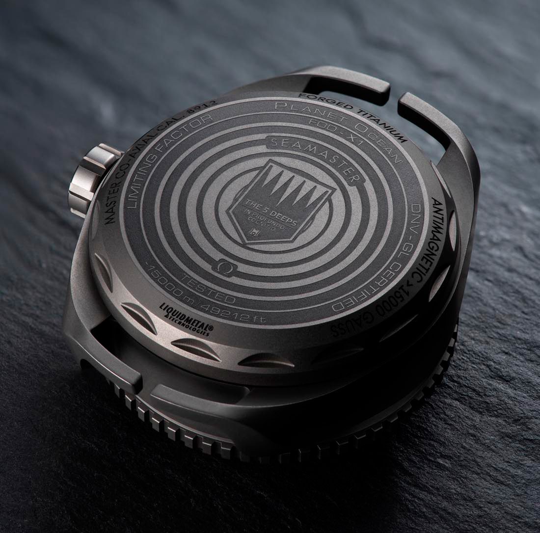 На задней крышке часов выполнена лазерная гравировка с изображением логотипа экспедиции Five Deeps. Частью сложного рисунка являются расходящиеся от логотипа круги, которые намекают на то, что во время погружения была использована технология многолучевого эхолота. Там же, на задней крышке можно увидеть и другую важную информацию, в частности серийный номер модели и указание на использованные материалы.