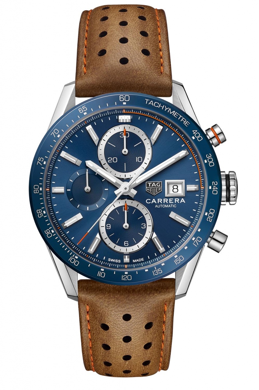 Новая модель Carrera Calibre 16 Chronograph от швейцарской часовой компании TAG Heuer имеет круглый корпус с полированными и матовыми поверхностями, изготовленный из нержавеющей стали, диаметром 41,0 мм, водонепроницаемый до 100 метров. Завинчивающаяся рифленая заводная головка расположена на 3 часах, а пушеры хронографа - на 2 и 4 часах. Фиксированный безель с покрытием из синей или черной керамики с нанесенной на него круглой тахиметрической шкалой. Сапфировое стекло с двусторонним антибликовым покрытием защищает синий или черный циферблат с лучевой отделкой, с накладными продолговатыми часовыми маркерами, покрытыми, как и часовая и минутная стрелки, люминесцентным составом SuperLumiNova белого цвета.