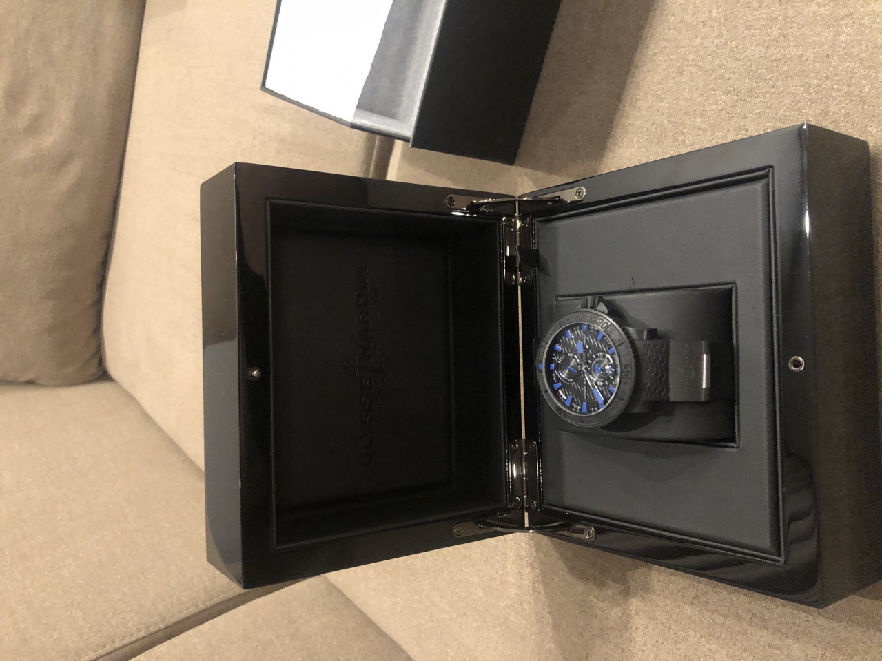 Пол: мужские Год покупки: 2015 БУ часы, состояние: AAA (идеальное) http://forum.watch.ru/images/market-question.png Полировка: нет Цена: 300 000 руб. (продажа) Коробка: есть Документы: есть Полный комплект. Идеальное состояние Пол: Мужские Тип: Часы Бренды: ULYSSE NARDIN Коллекция: MARINE Запас хода: 42 часа Водонепроницаемость: 20 бар (200 м) Корпус: нержавеющая сталь с покрытием из вулканизированного каучука Размер корпуса: 45,8 мм Стекло: выпуклое сапфировое с двусторонним антибликовым покрытием Браслет/Ремень: черный фактурный каучук Застежка: раскладывающаяся с кнопочными фиксаторами из титана Циферблат: черный с волновым объемным рисунком Безель: стальной однонаправленный с каучуковой вставкой и PVD-покрытием Механизм: автоматический калибр UN-26 (COSC) с индикатором запаса хода |