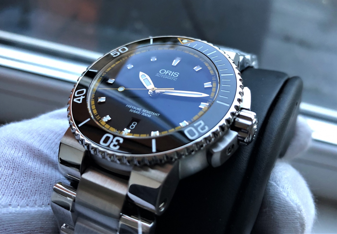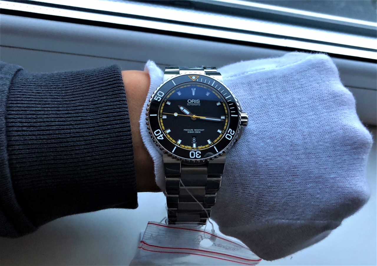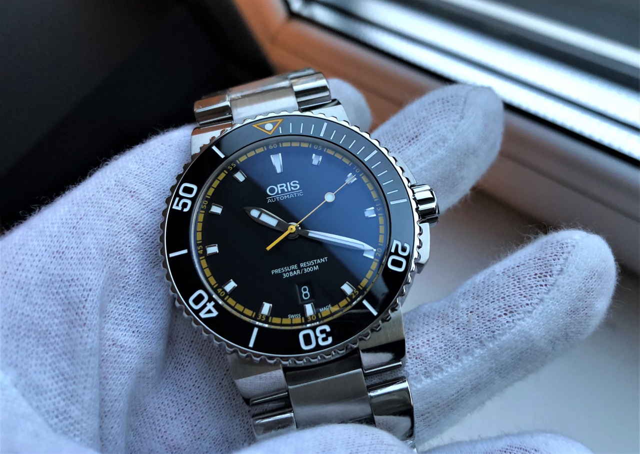 [ ДАЙВЕР ] / ORIS AQUIS / КЕРАМИЧЕСКИЙ БЕЗЕЛЬ / ЧЕРНЫЙ ЦИФЕРБЛАТ / ЖЕЛТАЯ ОКАНТОВКА / БРАСЛЕТ / 43 ММ