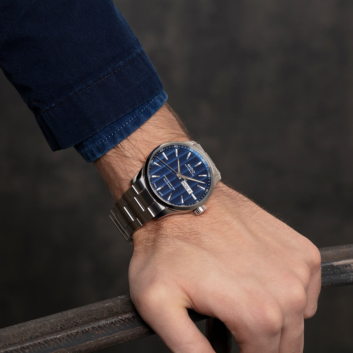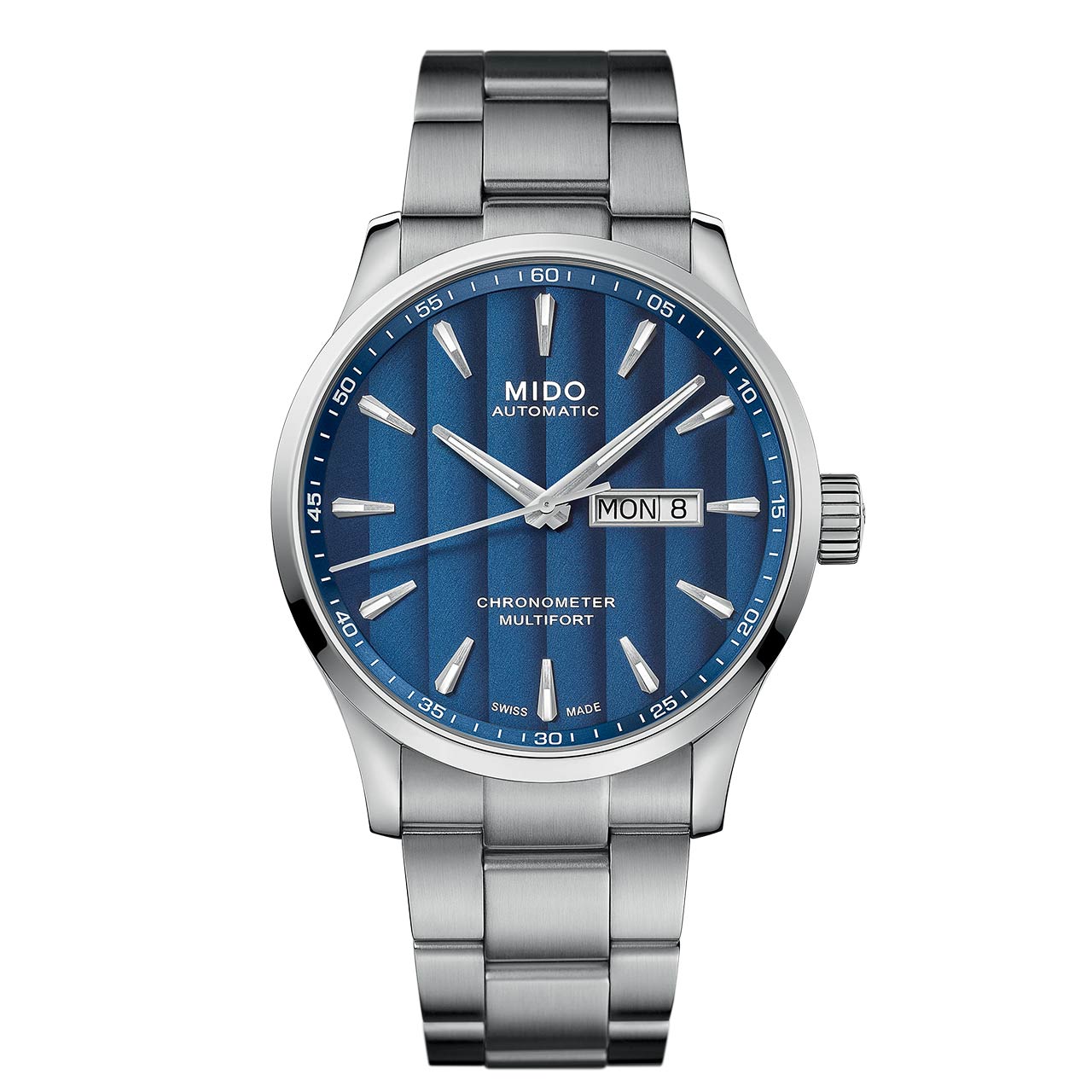 Вложений: 6 Дизайн новой модели Multifort Chronometer1 (ref. M038.431.11.041.00) от швейцарской часовой компании Mido выполнен в лаконичном классическом стиле. Ее корпус круглый, с полированными и сатинированными поверхностями, изготовленный из нержавеющей стали 316L, трехкомпонентный, диаметром 42,0 мм, водонепроницаемый до 100 метров. На торце крупной завинчивающейся рифленой заводной головки, расположенной на 3 часах, выгравировано наименование бренда MIDO. Сапфировое стекло установлено на передней стороне часового корпуса (выпуклое, с двусторонним антибликовым покрытием) и на его завинчивающейся задней крышке. Циферблат ярко-синего цвета, декорированный вертикальными женевскими полосками (которые визуально делают циферблат темнее или светлее в зависимости от освещения), с продолговатыми гранеными часовыми индексами, часовой и минутной стрелками, покрытыми люминесцентным составом SuperLumiNova.