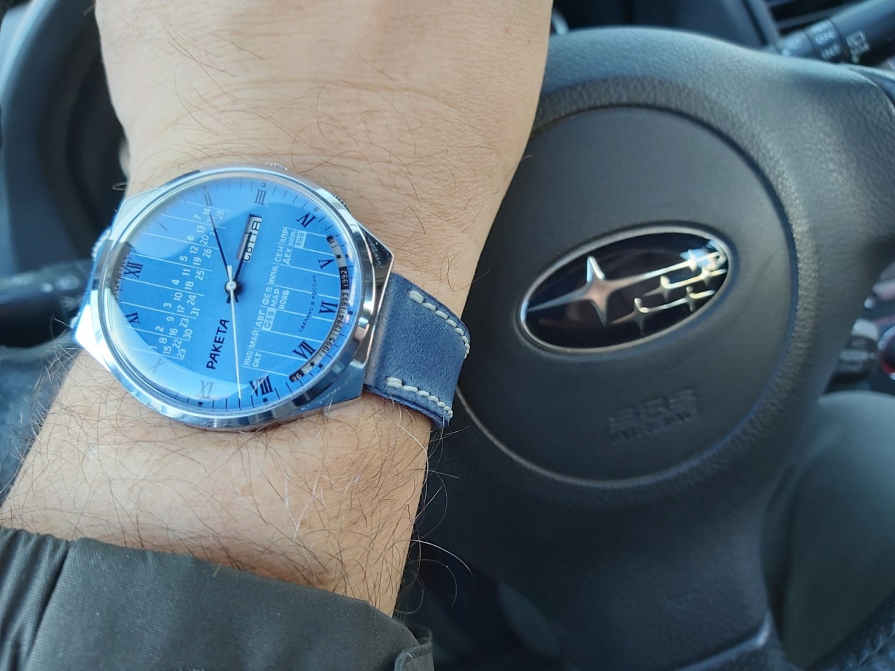 Продолжается результативное общение с S.T.strap. Александр и Татьяна сделали ещё один ремешок для ещё одних моих часов – Ракеты под названием Вечный календарь. Хотелось несколько подчеркнуть ремешком их цвет и своеобразный дизайн (про Ориент я в курсе, но всё равно дизайн не заурядный). Ракета заметно больше, чем ранее показанный Маяк и заметно тяжелее. Соответственно, стилистически для неё (Ракеты) нужно ремешок побольше и, возможно, поплотнее чем предыдущий. Ну и цвет нужно было выдержать не отклоняясь от сине – бело – чёрной гаммы. Обсудили с Татьяной и Александром. В результате получилось вот что: