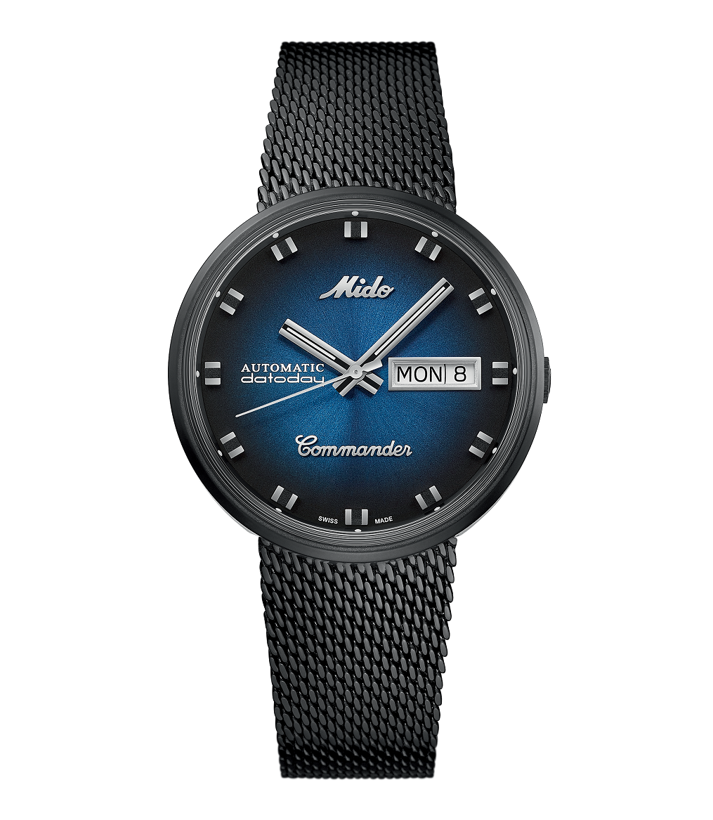Новинка этого года выполнена в 37-миллиметровом стальном корпусе (WR 50 м) с пескоструйной обработкой PVD-покрытия черного цвета, что подчеркивает чистоту линий и акцентирует внимание на циферблате. Дымчатая сатинированная поверхность последнего с двухтонным черно-синим градиентом создает невероятно интересный облик, где накладные часовые метки отполированы и покрыты черным лаком, что служит отсылкой к силуэту Эйфелевой башни. Для идеальной читаемости в ночное время люминесцентным составом Super-LumiNova наделены 12 точечных меток на внутреннем ранте, а также центральные проточки прямоугольных указателей часов и минут, отделанных способом алмазной огранки. Центральная стрелочная индикация вкупе с дисковыми указателями даты и дня недели в положении «3 часа» базируется на автоматическом калибре Mido Caliber 80 (основа — ETA C07.621) с 3-герцовым балансом и запасом хода в 80 часов. Завершает образ Commander Blue Shade браслет миланского плетения из нержавеющей стали с черным PVD-покрытием и скользящей застежкой. Вложение 2869538 Вложение 2869545 Вложение 2869546 Источник: https://watchdaily.ru/news/16911 |