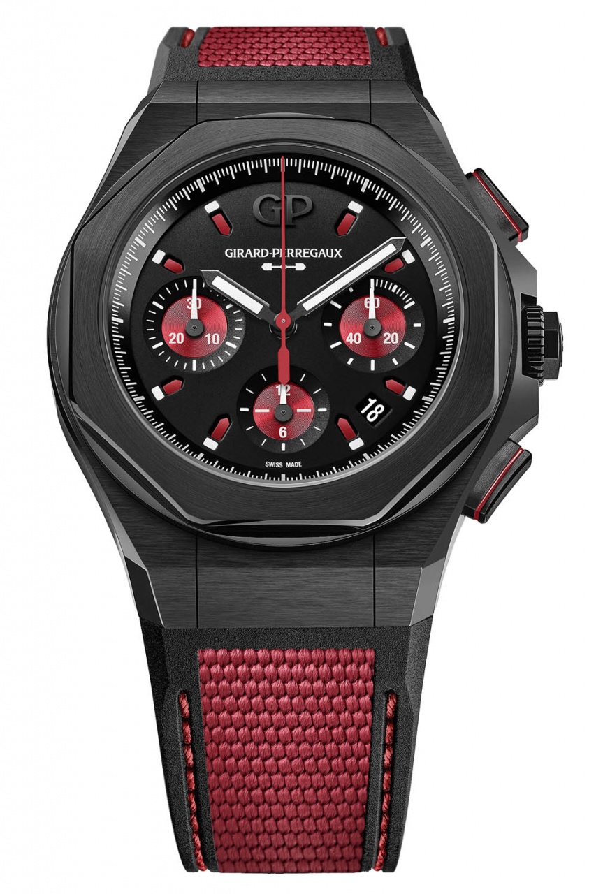 Новая лимитированная модель Laureato Absolute Passion (Ref. 81060-21-692-FH6A) от швейцарской часовой компании Girard-Perregaux имеет круглый корпус, изготовленный из титана с черным PVD-покрытием, диаметром 44,00 мм, толщиной 14,65 мм, водонепроницаемый до 300 метров. На торце завинчивающейся защищенной рифленой заводной головки, расположенной на 3 часах, выгравирован логотип бренда Girard-Perregaux. Пушеры хронографа размещены на 2 и 4 часах. Фиксированный восьмиугольный безель. Сапфировое стекло с антибликовым покрытием защищает циферблат матово-черного цвета, выполненный в стиле сэндвич, с вырезанными часовыми маркерами с красной подложкой и с белыми люминесцентными индексами, а также с часовой и минутной стрелками, покрытыми люминесцентным составом белого цвета.