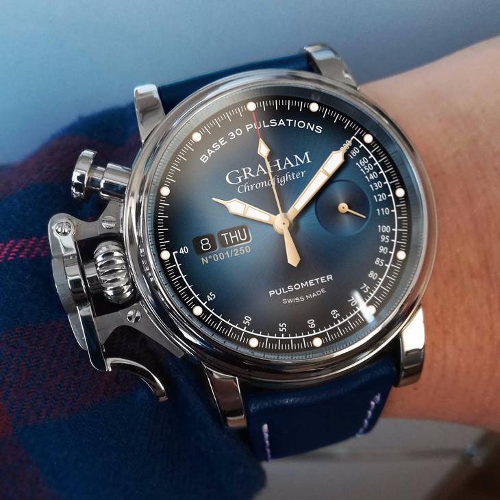 "Chronofighter Vintage Pulsometer Ltd доступен с серебряным или черным циферблатом с лучистым гильоше. (Здесь надо отметить, что сейчас доступна и новая модель, с синим лучистым циферблатом) Компоновка циферблата элегантная и лаконичная. Малый секундный циферблат без дополнительной разметки хорошо сбалансирован относительно индикаторов даты и дня недели, расположенных у 9-ти часовой отметки. Счетчики минут и часов хронографа в этой модели отсутствуют просто потому, что фокус сконцентрирован на основном назначении - измерение пульса (сердечного ритма). Таким образом, функции хронографа ограничены показаниями центральной секундной стрелки с тонким красным наконечником для шкалы пульсометра (откалиброванной для 30 сердечных сокращений), обрамляющей циферблат , что, на самом деле, более чем достаточно, учитывая назначение этих часов. (Пульсометры, так называемые докторские часы - это хронографы со шкалой, обеспечивающей простое, быстрое и надежное считывание пульса. Врач запускает хронограф, отсчитывает 15 или 30 пульсаций (данная модель откалибрована под 30 пульсаций), а затем останавливает хронограф, чтобы увидеть пульс пациента в минуту по пульсометрической шкале.) Концепция отсутствия минутного и часового накопителя хронографа может показаться некоторым малоинформативной, однако это продиктовано сновным назначением часов и делает циферблат чистым и лаконичным. Золотистые часовые метки покрыты светонакопительным составом Superluminova, так же как и стрелки часов. Малый секундный циферблат имеет спиралевидную отделку. Под указателями дня и даты на циферблате расположен лимитированный номер часов, что является оригинальным штрихом. Chronofighter Vintage Pulsometer Ltd оснащен автоматическим калибром G1718. Через прозрачную заднюю крышку хорошо просматривается архитектура механизма с его рычажно-кулачковой системой и легко заметить, что он основан на надежной рабочей лошадке Valjoux 7750. Механизм работает на частоте 28 800 полуколебаний в час с двухдневным запасом хода. Механизм декорирован прямыми женевскими волнами и перлажем. Мягкий ремешок из телячьей кожи с классической пряжкой дополняет винтажный образ часов. В целом Chronofighter Vintage Puslometer Ltd, без сомнения, является одной из самых красивых версий модельного ряда хронографов Graham. То, как им удалось соединить лаконично-смелый характер модели с винтажным образом в изысканном облике, по достоинству оценят поклонники бренда и другие любители часов." Текст статьи взят отсюда https://monochrome-watches.com/graha...-review-price/ Также информацию можно уточнить на сайте производителя www.graham1695.com. |