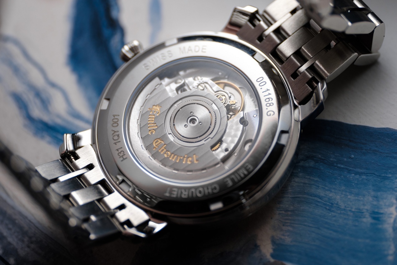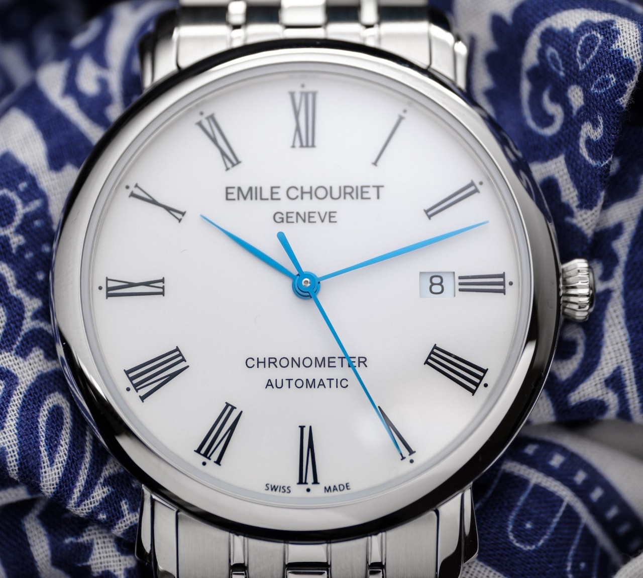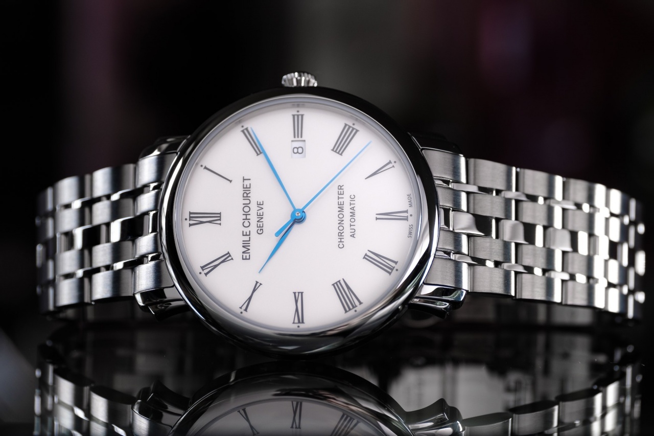 Новая модель Lac Léman Classic Chronometer (Ref. 00.1168.G40.6.6.25.6) от швейцарской часовой компании Emile Chouriet имеет круглый корпус с полированными и сатинированными поверхностями, изготовленный из нержавеющей стали, диаметром 40,0 мм, водонепроницаемый до 30 метров. Рифленая заводная головка расположена на 3 часах. Фиксированный тонкий полированный безель. Сапфировое стекло установлено на передней стороне часового корпуса и на его завинчивающейся задней крышке. Циферблат белого цвета, лаковый с черными римскими цифрами. Стрелки вороненные.