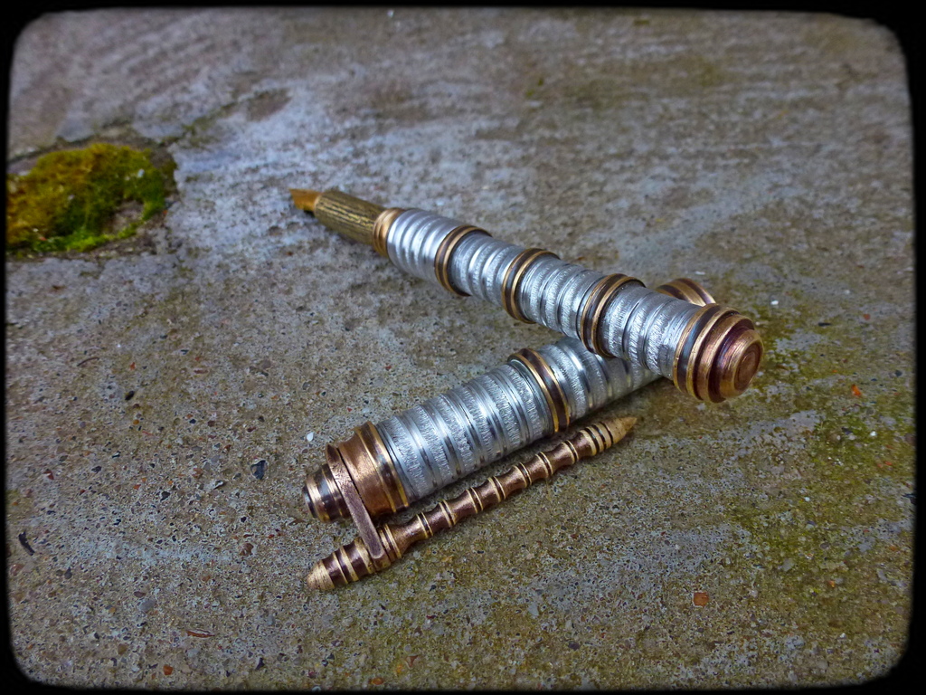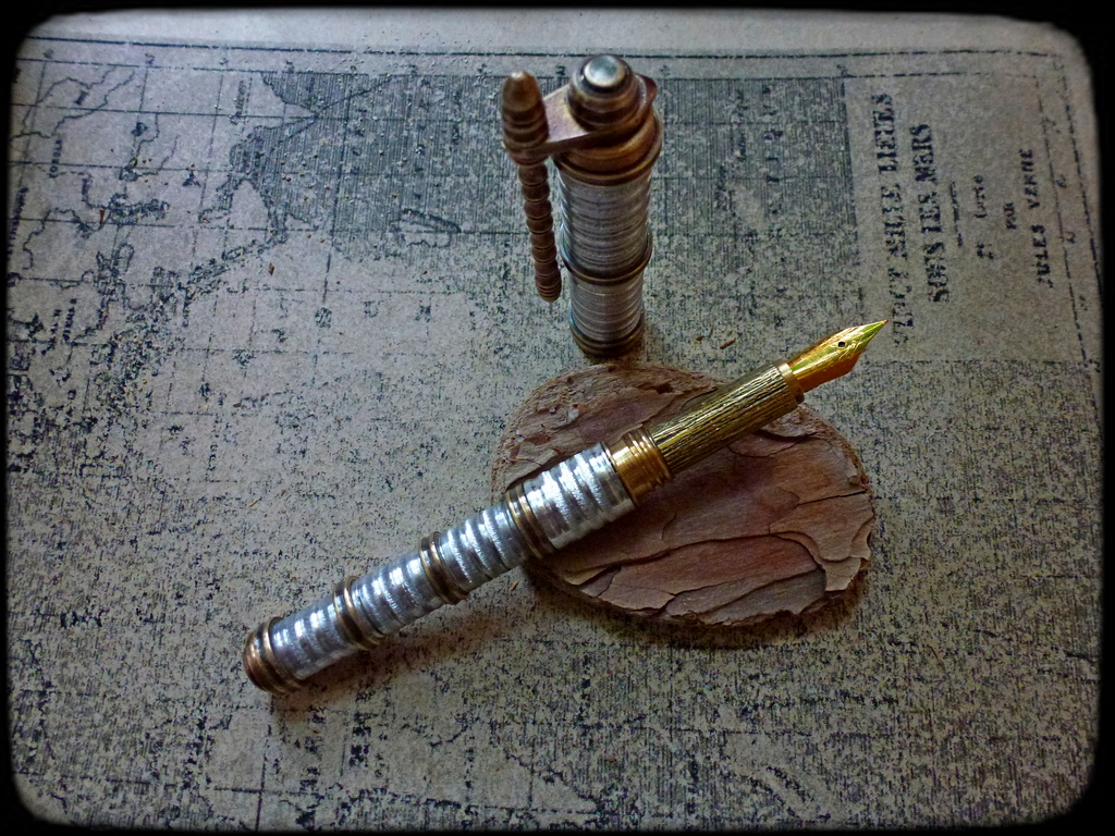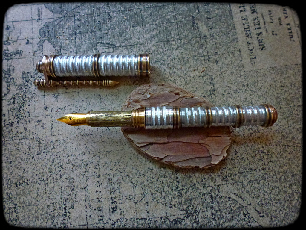 В продаже новая перьевая ручка в стиле "Стимпанк". Ручная работа, единственный экземпляр. Материалы - латунь и магниевый сплав. Уникальная фактура поверхности, очень интересные тактильные ощущения. Применены различные виды обработки поверхностей, сделано состаривание и патинирование. Использовано перо толщиной "F" (тонкое), Заправка - стандартный международый картридж. Цена 8000 рублей + почтовые расходы. Подробности в ЛС.