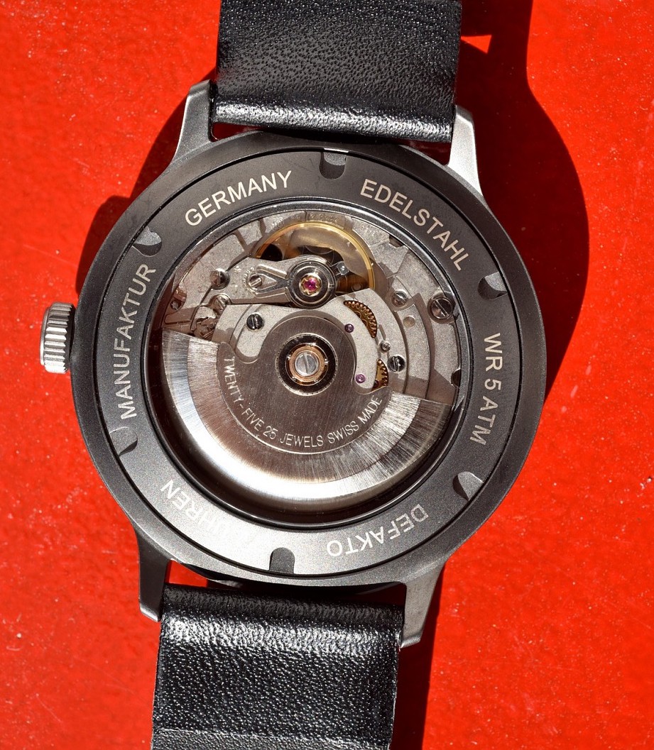 Поставляется на немецком кожаном ремешке с застежкой из нержавеющей стали с черным PVD-покрытием.