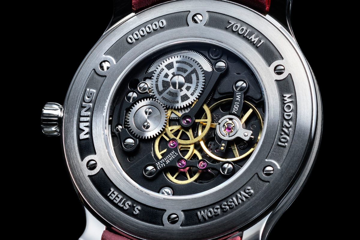 В Ming 27.01 используют механизм с ручным заводом на основе ETA Peseux 7001. Калибр серьезно переработан, от штатного механизма сохранили только колесную систему и спуск, мосты и платина были изготовлены заново в сотрудничестве с мануфактурой Schwarz-Etienne. Через заднюю крышку с сапфировой вставкой можно рассмотреть платину и мосты механизма с защитно-декоративным черным хромовым покрытием. Мосты выполнены таким образом, чтобы максимально открыть движущиеся детали механизма.