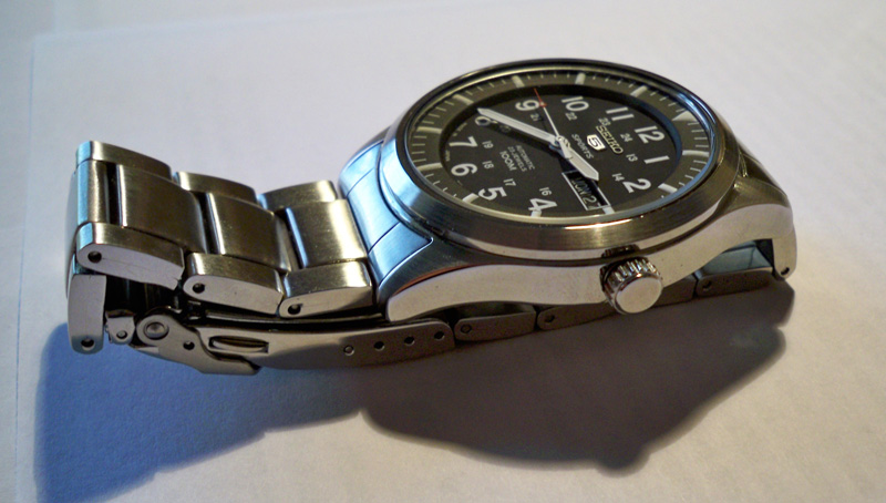 На циферблате и на задней части корпуса пишут что часы Made In Japan, метки и стрелки покрыты Lumibrite, задняя крышка прозрачная, день недели оказывает на английском и еще на каком-то языке (иероглифы, то ли японский, то ли арабский), стекло минеральное hardlex crystal, механизм 7S36, водозащита 100m, корпус 40.5mm * 12mm Верхняя часть корпуса и браслета сатинированная, а боковая часть корпуса и "ребpа" звеньев браслета - полированные (жаль что всё полностью не сатинированное, а то на полированных поверхностях царапины очень хорошо видно). Вложение 88125 Вложение 88126 Вложение 88127 Вложение 88130 Вложение 88131 Если немного подержать под лампой, то метки и стрелки светятся в темноте, даже на секундной стрелке есть небольшая метка с люминофором, фотик у меня дешевый и плохо передает то как ярко они светятся: Вложение 88128 Вложение 88129 Весьма рад покупкой (искал часы с легко читаемым циферблатом), хотя сравнивать мне особо не с чем, до этого у меня были кварцевые Tissot, форма и отделка корпуса и браслета у tissot была конечно лучше, но и цена выше раза в 4: Вложение 88132 Вложение 88133 Также было дело заказывал вот такие Archimede: http://www.archimede-watches.com/ima...M19-a11-15.jpg которые мне не понравились (форма и отделка корпуса) и я их вернул, а тут за цену в 3,5 раза меньше получил сейко которые мне нравятся внешне, конечно в них механизм не ЕТА, секундная стрелка не останавливатся при выставлении времени и нет сапфирового стекла, но в реальной жизни смотрятся они гораздо лучше тех архимедов. И кстати в архимедах тикание механизма ETA 2824-2 было довольно громким, если подпереть подбородок ладонью, то тикание было отчетливо слышно, в этом плане сeйко гораздо тише, возможно на это влияет толщина корпуса часов, или просто разные механизмы с разным уровнем шума. Единственно, возник вопрос насчет гарантии seiko: на сайте где я покупал пишут Цитата: