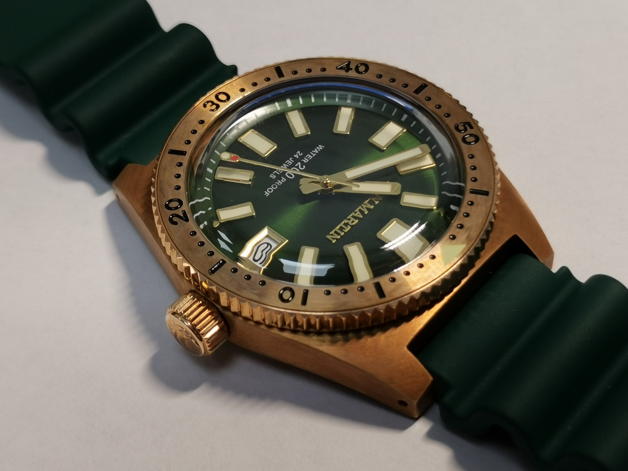 Сегодня хочу рассказать о моих новых часах от Сан Мартина. Давно я приглядывался к этой модели. Первые статьи о ней я прочитал на этом форуме. Часы являются хомажем дайверской модели часов от Сейко. Первые хомажи были выполнены в стали, имели серый циферблат, и красивые буквы LTM. Пока я терзался сомнениями, Сан Мартин выпустил эту модель в бронзе, что добавило интереса к ней. Я выбрал вариант с зеленым циферблатом, хотя покушался было на вариант с фрагментом картины Кацусика Хокусая, - Большая волна на Канагава.
