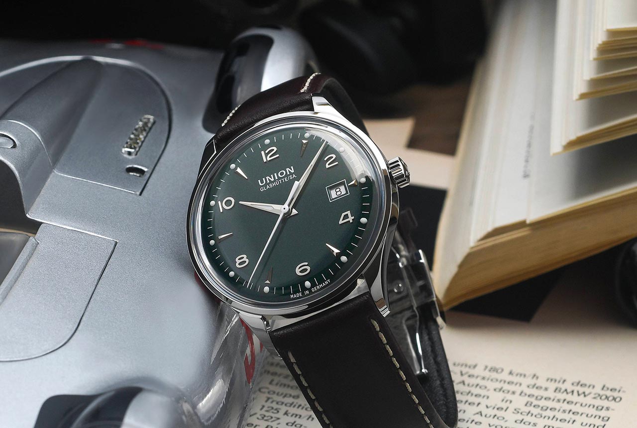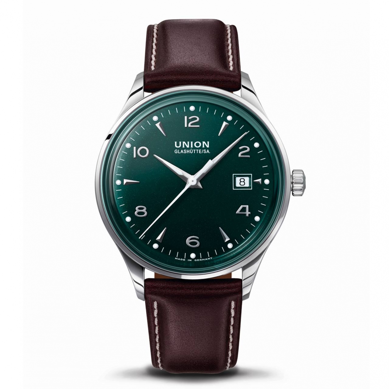Дизайн новой модели Noramis Date (Ref. D012.407.16.097.00) от немецкой часовой компании Union Glashütte, благодаря циферблату British Racing Green и ремешку из мягкой британской кожи, вызывает ассоциации с классическими английскими гоночными автомобилями. Круглый полированный корпус новинки, изготовленный из нержавеющей стали, диаметром 40,00 мм, толщиной 9,85 мм, водонепроницаемый до 100 метров. На торце завинчивающейся рифленой заводной головки, расположенной на 3 часах, выгравировано изображение бренда Union Glashütte. Сапфировое стекло установлено на передней стороне часового корпуса (выпуклое) и на его завинчивающейся задней крышке. Темно-зеленый циферблат имеет металлическое мерцание, полученное благодаря использованию крошечных металлических частиц в лаке. Накладные арабские цифры и конические граненые часовые индексы. Люминесцентное покрытие SuperLumiNova белого цвета на конических часовой и минутной стрелках и на точечных часовых маркерах.