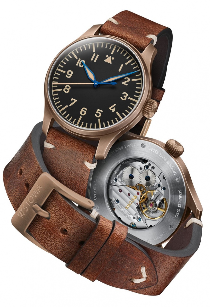 Новая модель Flieger Bronze Vintage от немецкой часовой компании Stowa имеет круглый корпус, изготовленный из искусственно состаренной бронзы, диаметром 40,0 мм, толщиной 9,2 мм. Крупная рифленая завинчивающаяся заводная головка расположена на 3 часах. Сапфировое стекло установлено на передней стороне часового корпуса и на его завинчивающейся задней крышке, выполненной из нержавеющей стали. Матово-черный циферблат с арабскими цифрами и маркерами, покрытыми, как и вороненые стрелки, люминесцентным составом винтажного бежевого цвета.