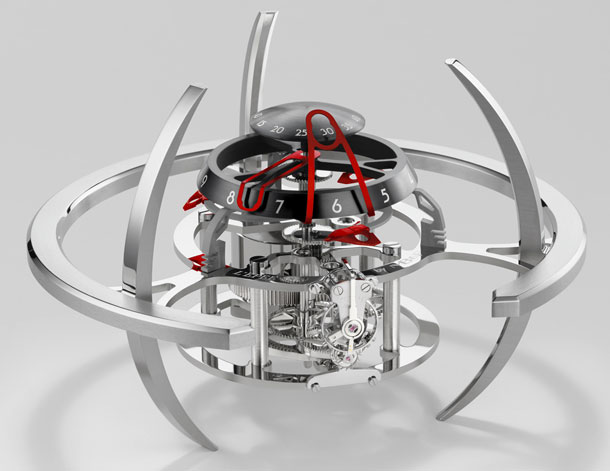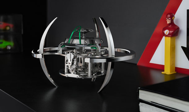 Разработанные дизайнерами MB&F «межгалактические» настольные часы-робот Starfeet Explorer изготовлены в мастерских L’Epée 1839, единственной швейцарской мануфактуры, специализирующейся на производстве настольных часов. Помимо отсчета часов и минут, они оснащены анимационной функцией, в ходе которой космические корабли совершают 5-минутный орбитальный полет вокруг станции. Притягивающий взгляд механизм собственной разработки отличается превосходной отделкой и располагает исключительным восьмидневным запасом хода. Его можно заводить вручную двухсторонним ключом, который также служит для настройки времени. Индикация часов и минут осуществляется при помощи двух дисков, апертуры и ярко окрашенной стрелки. А если точнее, то текущие минуты, начертанные на вращающейся радиолокационной антенне, считываются в центре неподвижной металлической апертуры с ручной сатинированной отделкой и анодированным покрытием, которая повторяет изогнутые контуры купола. Индикация часов осуществляется часовой стрелкой – также с сатинированной отделкой и анодированным покрытием, – которая вращается вокруг неподвижного 12-часового диска, расположенного под минутным диском. Starfleet Explorer также привлекает внимание совершенно оригинальной новой деталью – флотом из трех миниатюрных космических кораблей, размещенных на одной оси через одинаковые промежутки в центре механизма. Они совершают полный оборот каждые пять минут, а их управление ведется с космической станции. Горизонтально расположенный механизм Starfleet Explorer оснащен вертикальным спуском. Безупречно обработанные детали из нержавеющей стали или латуни с палладиевой отделкой (за исключением 11 камней) спроектированы и изготовлены в швейцарском ателье L'Epee 1839. Скелетонизированная платина и круглая С-образная внешняя структура открывают вид на зубчатые колеса и заводной барабан. Starfleet Explorer может опираться на оба конца вертикального посадочного шасси – крайне удобно для завода часового механизма и настройки времени. Часы также можно расположить с наклоном в сторону, что позволяет рассмотреть оригинальную межгалактическую станцию в разных ракурсах. Модель Starfleet Explorer выпущена тремя лимитированными сериями из 99 экземпляров в синей, зеленой и красной версиях. Starfleet Explorer – это настольные часы, оснащенные практически такими же механизмами и деталями, что и наручные часы, но только более крупных размеров: трансмиссией, заводным барабаном, балансовым колесом, спусковым колесом и анкерным рычагом. Регулятор производства L'Epée 1839 также располагает противоударной системой Incabloc, обычно применяемой только в наручных часах, что сводит к минимуму риск повреждения часов в случае их транспортировки. Многие могут подумать, что работать над более крупными деталями легче. Однако, вопреки ожидаемому, ручная отделка настольных часов сопряжена с большими трудностями, чем отделка наручных моделей, из-за размера их деталей. Арно Николя, исполнительный директор L’Epée 1839, объясняет: «Дело не только в том, что на отделку в два раза большей по размеру детали уйдет в два раза больше времени. В данном случае сложность возрастает в геометрической прогрессии. Так, при выполнении полировки необходимо выдержать одинаковую силу нажатия на гораздо большей поверхности, чем при обработке деталей наручных часов, и это сложнее в