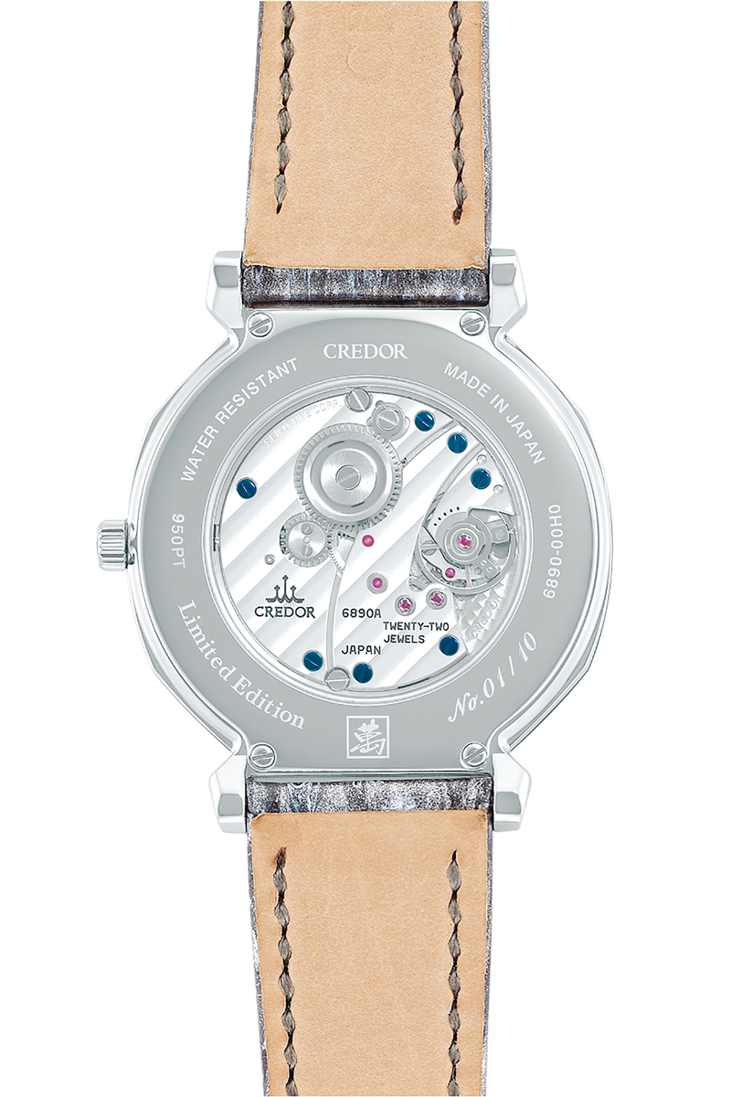 В новой модели Credor Linealx Imari Nabeshimayaki Seiko использует мануфактурный механизм с ручным заводом Calibre 6890. При общей толщине всего 1,98 мм этот механизм сочетает в себе минималистичную архитектуру с филигранно выполненной отделкой. Перлаж на платине дополняется волнообразной отделкой мостов и крупными термически синеными винтами. Калибр работает на частоте 21 600 пкч и обеспечивает запас хода 37 часов. Продолжая тему водопадов, Credor комплектует часы уникально обработанными ремнями из кожи аллигатора цвета серого графита, произведенными знаменитым кожевенным заводом Kyoto. На серую кожу нанесен слой порошкового серебра, сверкающие зерна которого отлично подчеркивают грубую фактуру кожи аллигатора, обеспечивая при этом эффектный внешний вид. Будет выпущено всего 10 моделей Credor Linealx Imari Nabeshimayaki, которые доступны исключительно через официальных дилеров Credor по цене в 4 500 000 иен (примерно 42 000 $).