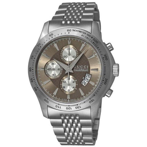 Модель оснащена автоматическим механизмом ETA Valjoux 7750, на 25 камнях, с балансовой частотой 28800 полуколебаний в час, запасом хода 40 часов, функциями индикации часов, минут (центральные стрелки), секунд (на боковом циферблате на 9 часах), даты (в секторной апертуре на 4 часах), хронографа (центральная секундная стрелка, 30-минутный счетчик на 12 часах, 12-часовый счетчик на 6 часах). Поставляется на кожаном ремешке или на браслете из нержавеющей стали. Цена модели составляет $ 1850. Источник: http://www.wristwatchhaven.com/gucci...c-chronograph/ |