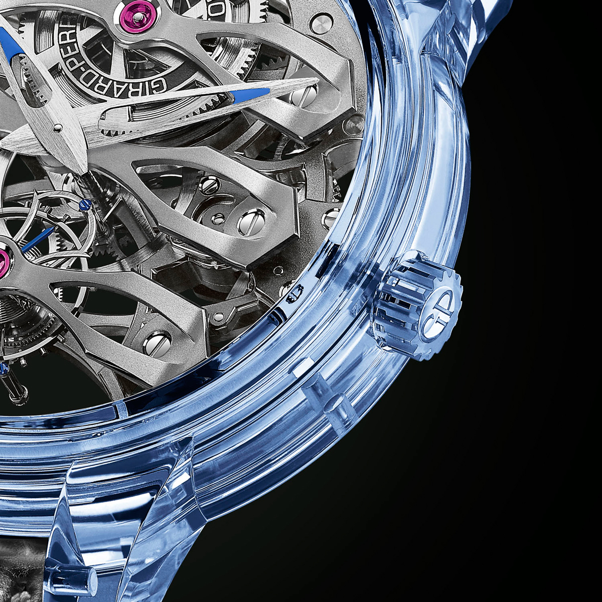 Quasar Azure отдают должное этому наследию, обеспечивая максимальную прозрачность для обзора уникального механизма. Синий сапфировый корпус новой модели диаметром 46 мм и высотой 15,25 мм изготовлен из цельного куска сапфира и тщательно отполирован. Благодаря прозрачным сапфировым стеклам на лицевой и тыльной стороне часов достигается идеальный обзор архитектуры скелетонизированного механизма. Фирменные три моста Girard-Perregaux больше не прямые и плоские, а выполненные в форме ажурных изогнутых арок, изготовленных из титана 5 класса. Турбийон в положении «6 часов», являющийся центром притяжения геометрии калибра, выделяется своей фирменной кареткой в форме лиры GP. Микро-ротор системы автоподзавода, выполненный из белого золота, расположен под барабаном, чтобы сохранить идеальную визуальную симметрию механизма.